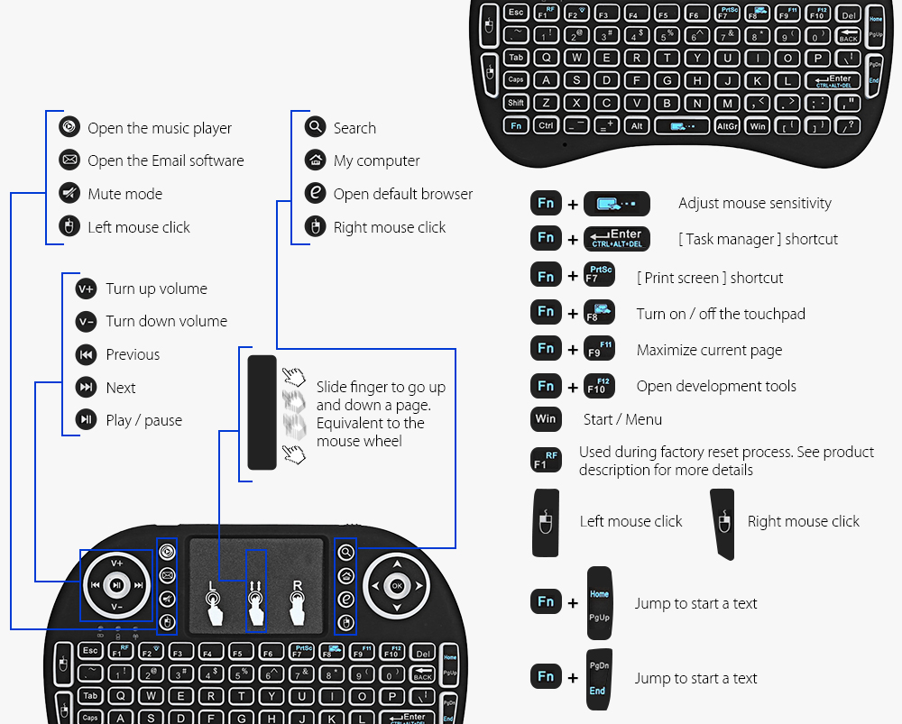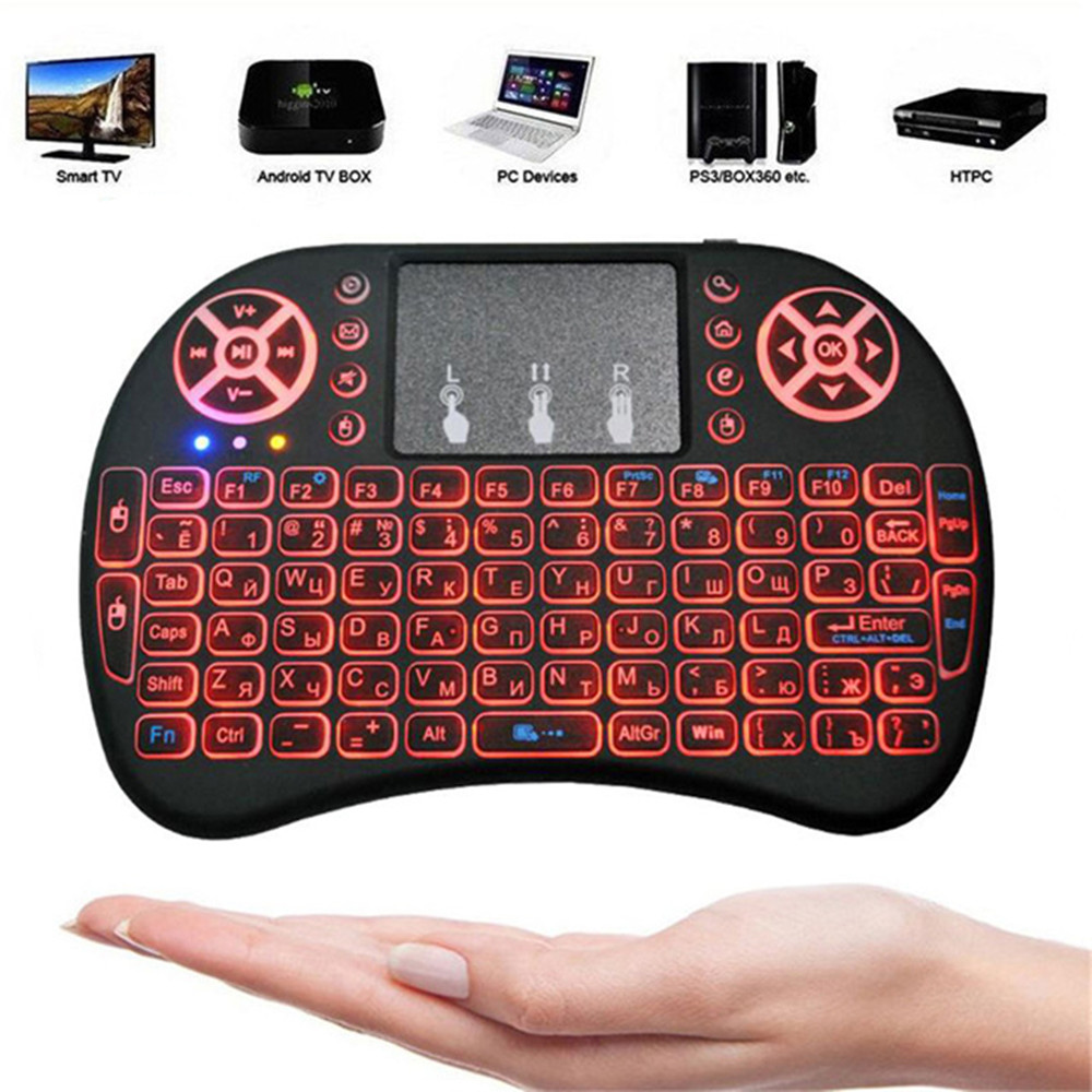 2.4G Mini keyboard with touchpad,LED backlit,multimedia control keys and PC gaming control keys.