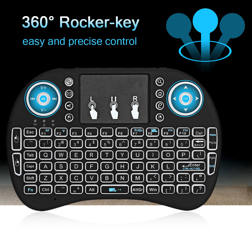 2.4G Mini keyboard with touchpad,LED backlit,multimedia control keys and PC gaming control keys.