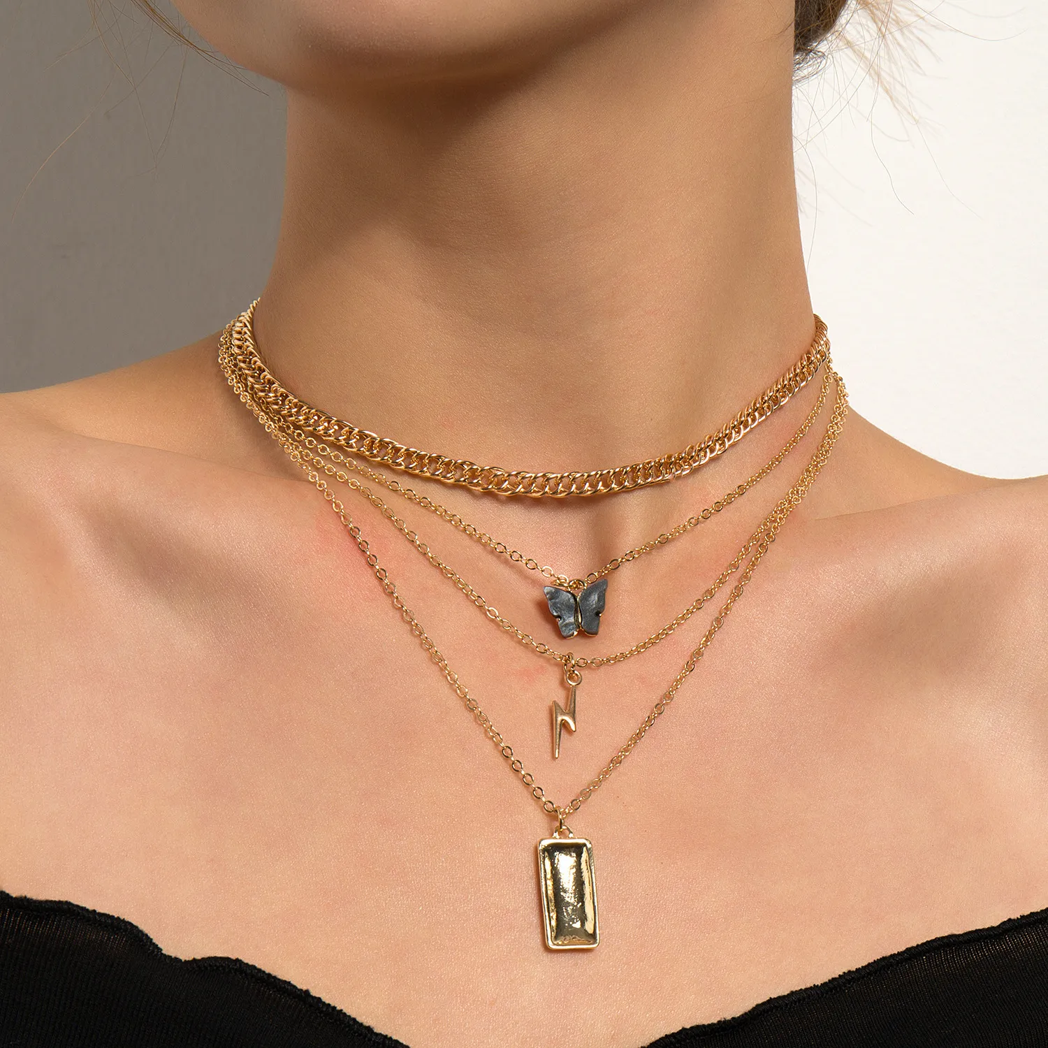 Lightning Butterfly Square Pendant Multilayer Necklace