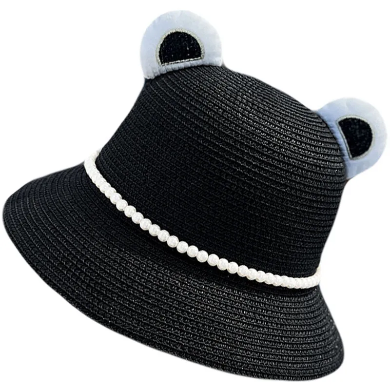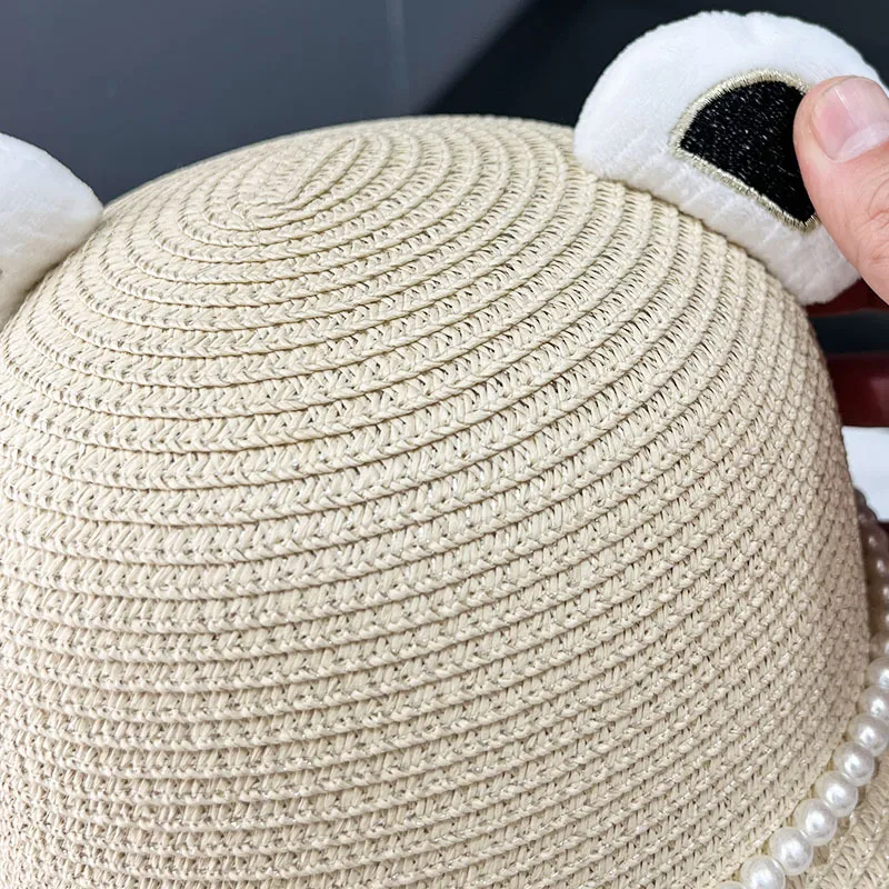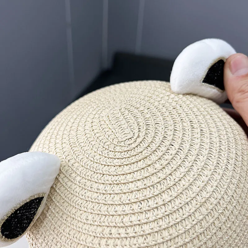 This adorable straw hat features charming little bear ears on the sides, combining practicality with a touch of fun. Whether your child is
