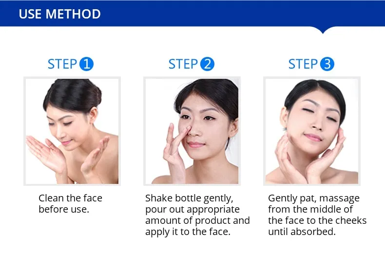 Step2: Agiter le flacon doucement, versez une quantité appropriée de produit et appliquez-le sur le visage.