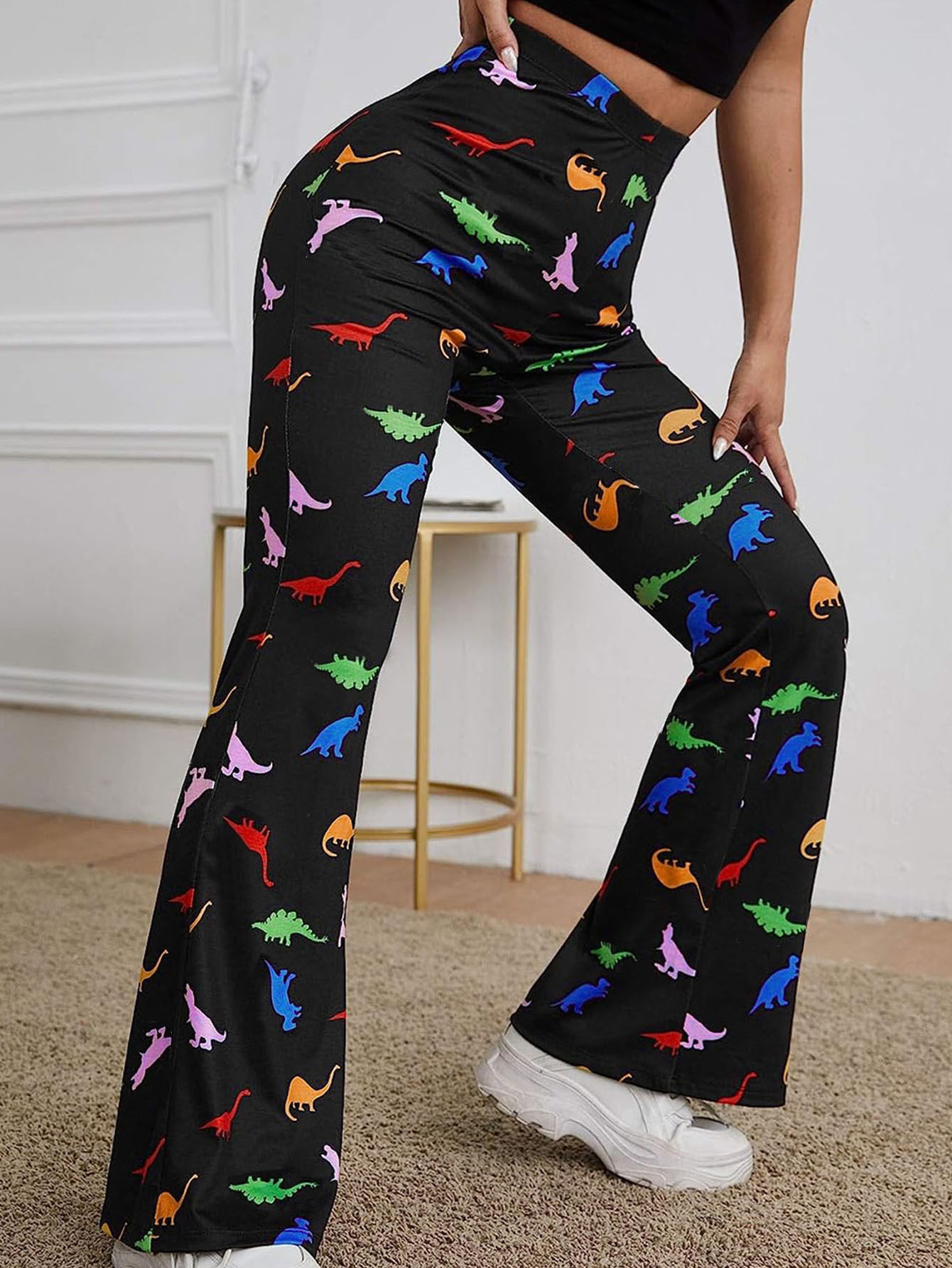 Long Bell-bottom Pants Dinosaur Printed High Waist High Elastic Trousers For Women