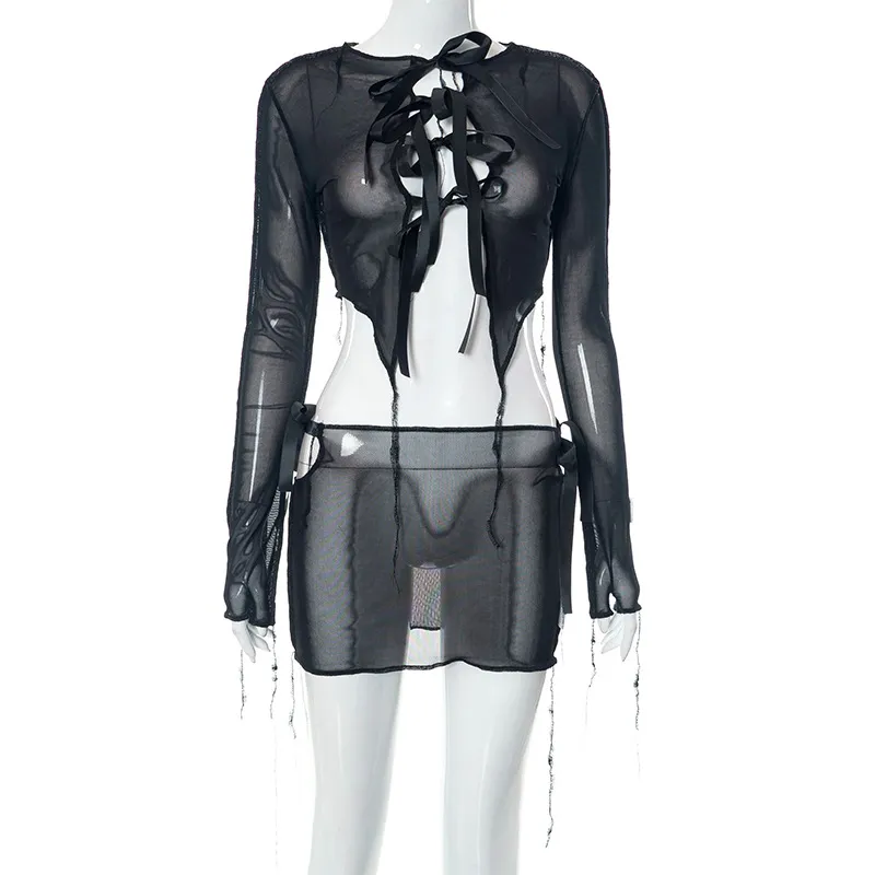 Long Sleeve Mesh Tie Two Piece Skirt Set