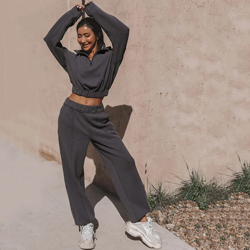 Long Sleeve Turtleneck Sweatshirt Stand Up Zipper Short Top With Loose Straight Leg Pants