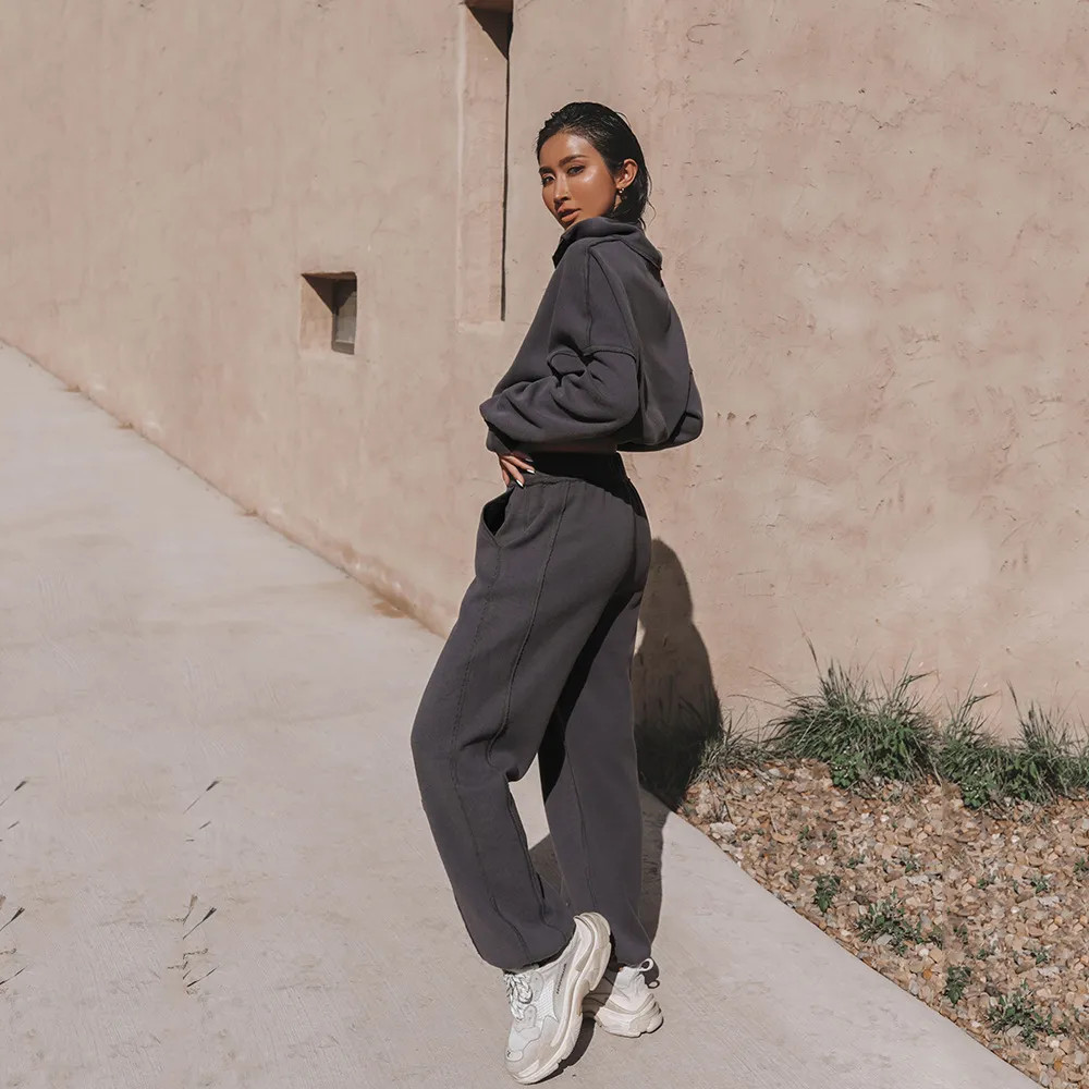 Crafted from a premium cotton blend, this outfit ensures a soft touch against the skin while providing durability. The turtleneck sweatshirt features a stand-up zipper, allowing you to adjust your look from casual to slightly formal effortlessly. The short top design is balanced with loose straight leg pants, offering a chic yet relaxed vibe suitable for various occasions.