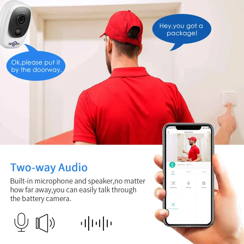 With built-in two-way audio, the camera allows you to listen to the surroundings and speak through the camera. This feature is perfect for interacting with visitors, family members, or even pets, providing added convenience and security.