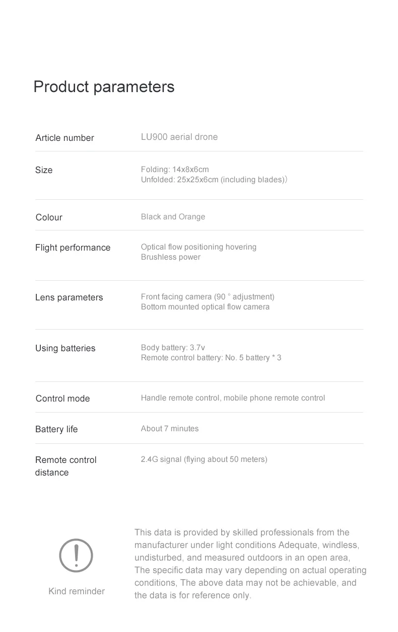 -One-click takeoff / landing. One-button take-off or landing automatically, the drone will take off or return to the take-off position.