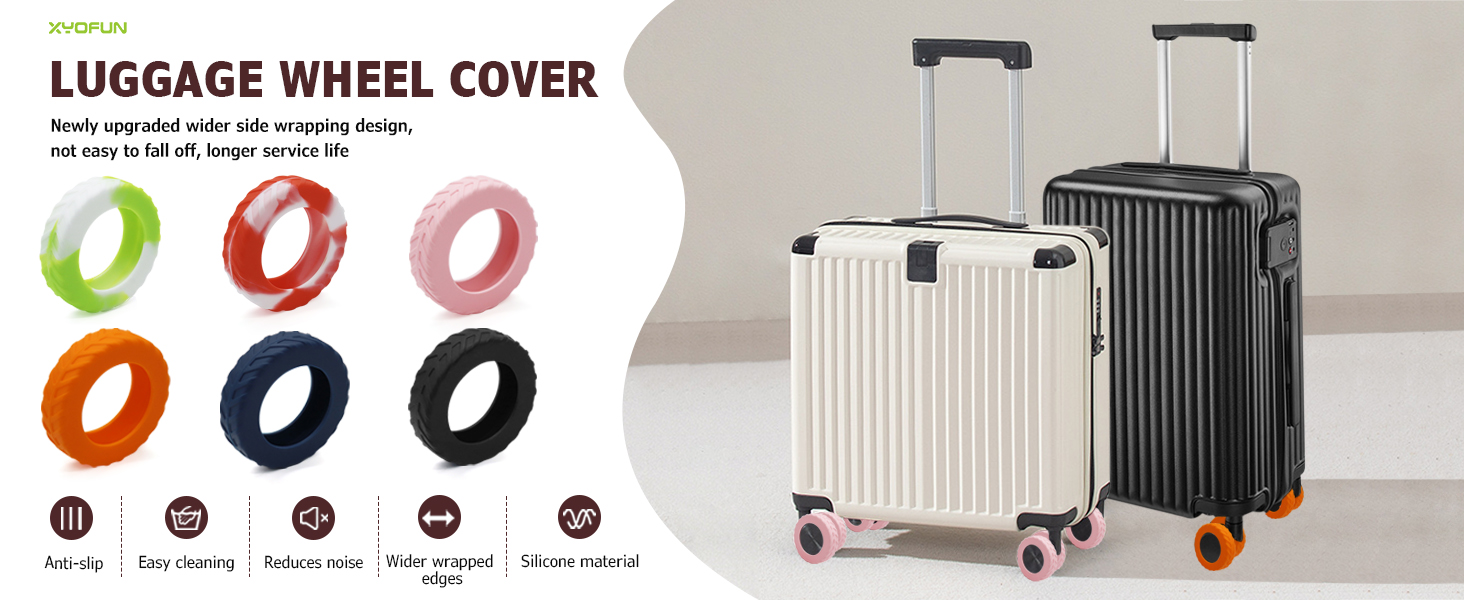 - [Reusable & Silent Smooth]The silicone material of Luggage Wheels Replacement Covers for suitcases helps reduce noise when rolling your suitcase, providing a quieter and more comfortable travel experience. Very easy to install and remove,It can be washed for reuse after each trip