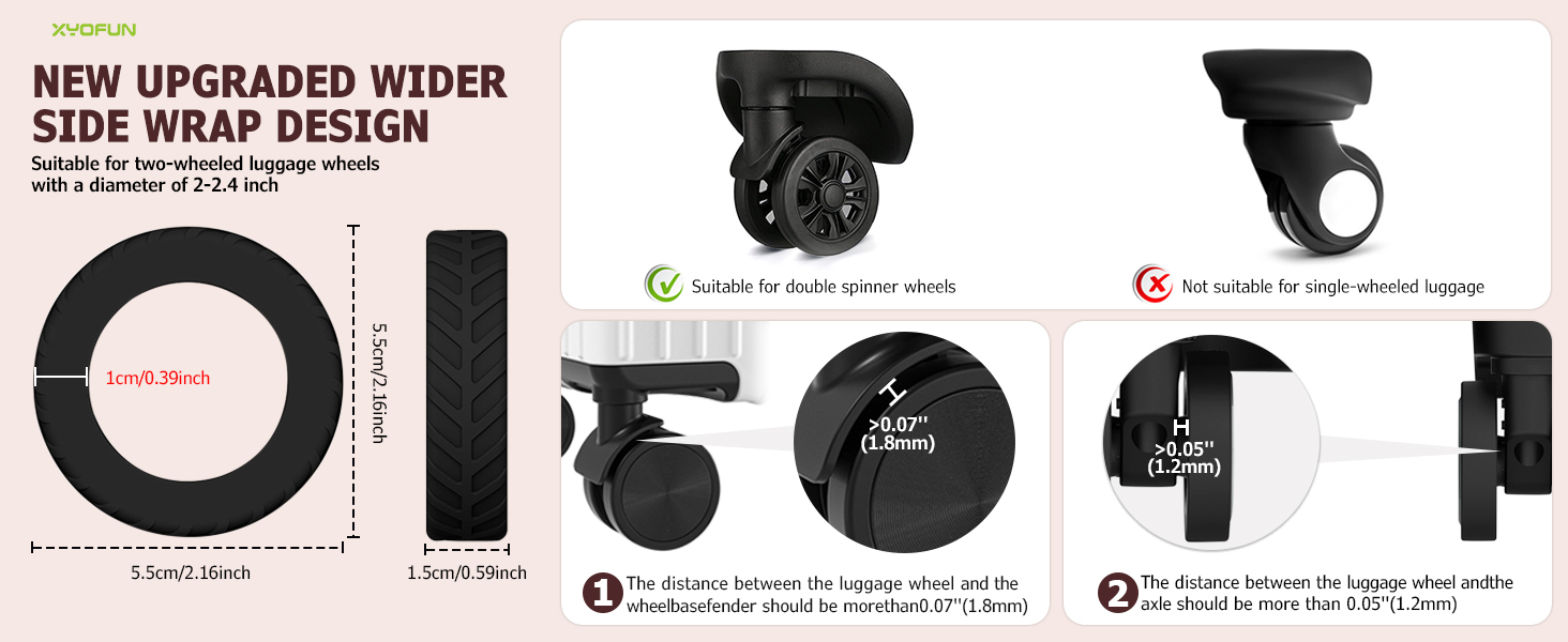 - For 2-2.4in 8 Wheels Suitcase: This Level 8 Luggage Wheel Protector is suitable for suitcases with wheel size between 2.0-2.4",the distance between the luggage wheel and wheel base fender should be more than 0.07"(1.8mm),and the distance between the luggage wheel and axle should be more than 0.05"(1.2mm)