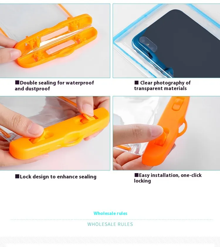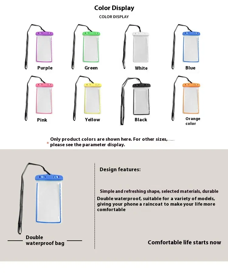 Made from high-quality, flexible PVC material, this waterproof phone bag is durable, lightweight, and easy to carry. The secure sealing mechanism keeps water out, and the adjustable strap allows for comfortable wearing around your neck or shoulder. Its compact design fits most smartphones, making it ideal for a wide range of devices.