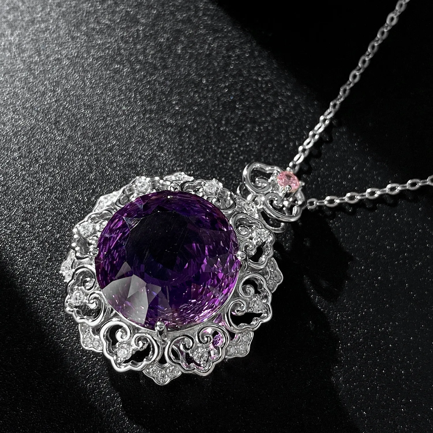 Luxurious S925 Silver Set Natural Amethyst Pendant Female Vintage Pattern Senior Jewelry Quality Sweater Chain