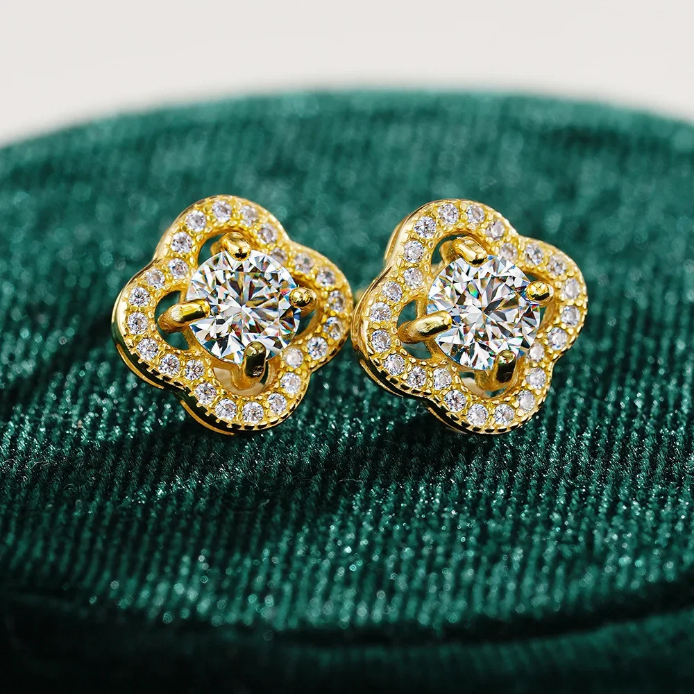 Luxury 100% Real 18K Gold Ring and Lucky Grass Moissanite Women's Stud Earrings