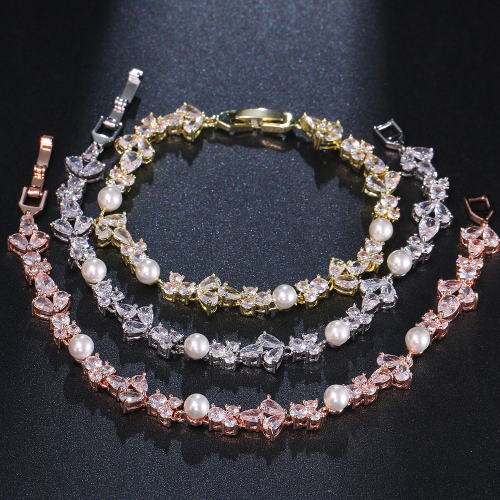 The delicate chain is adorned with intricately set zircons that catch the light beautifully, while the pearls add a classic touch of refinement. The secure clasp ensures a comfortable and safe fit, making this bracelet perfect for both everyday wear and special occasions. Whether you're attending a formal event or looking to add a touch of luxury to your daily attire, this bracelet is the perfect accessory to enhance your style.