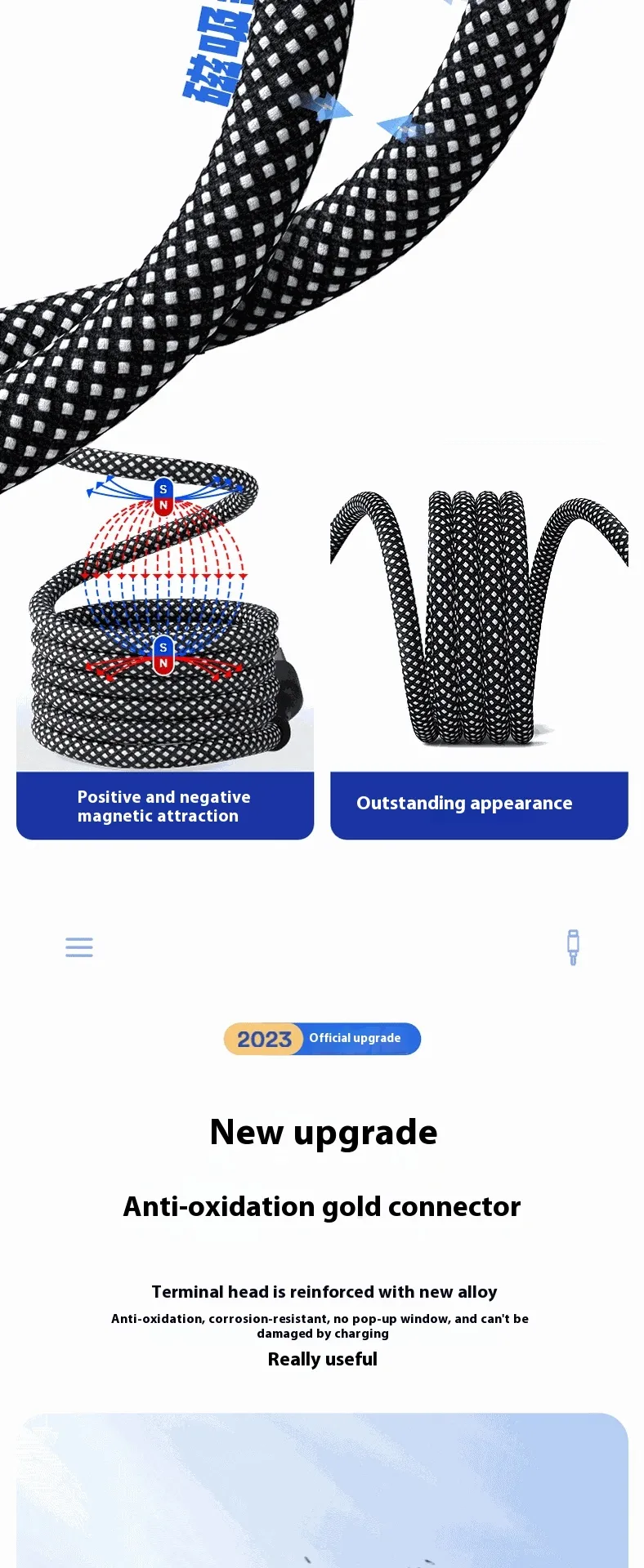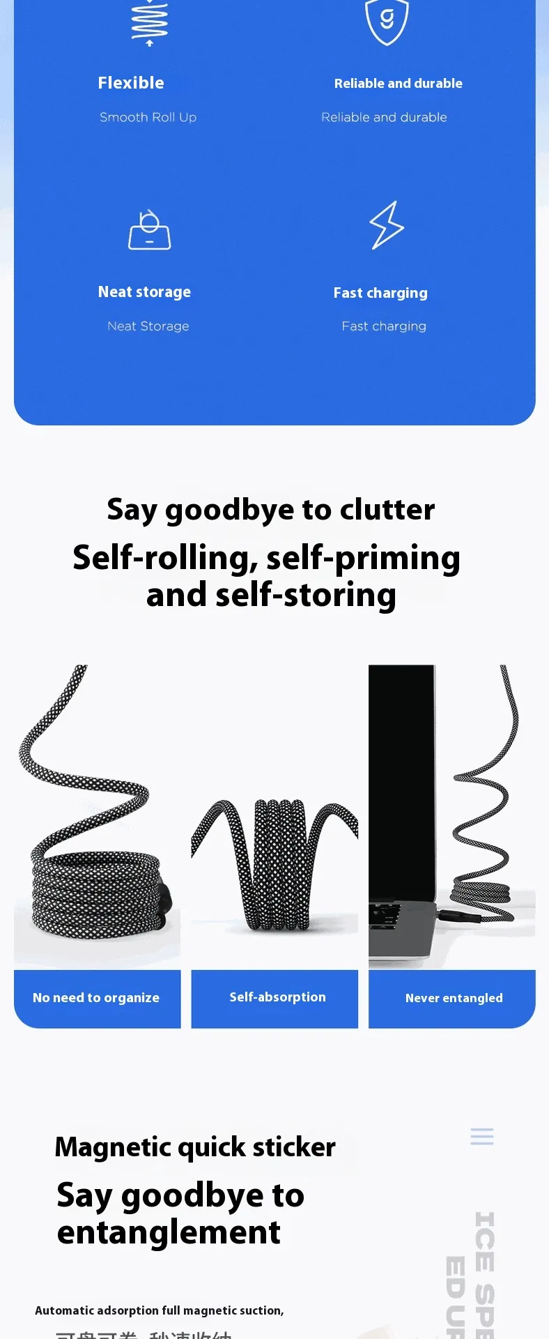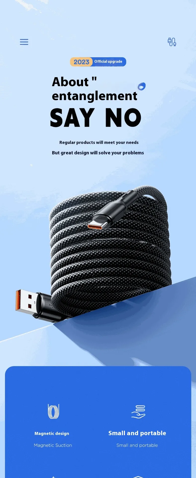 The Magnetic Anti-Tangle Cable offers an innovative solution to a common problem—tangled, messy cables. Whether you're at home, work, or on the go, this cable’s magnetic feature ensures a quick, easy connection without the frustration of knots and twists. Its robust design and universal compatibility make it an essential addition to any tech setup, whether you're looking for organization, durability, or convenience.
