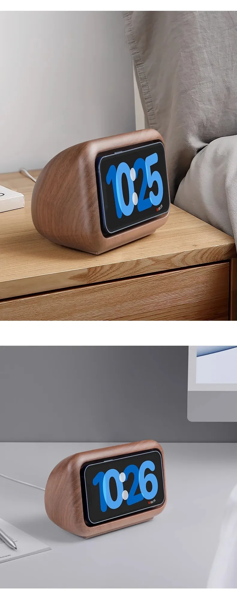 Small wooden alarm clock magnetic charging stand,