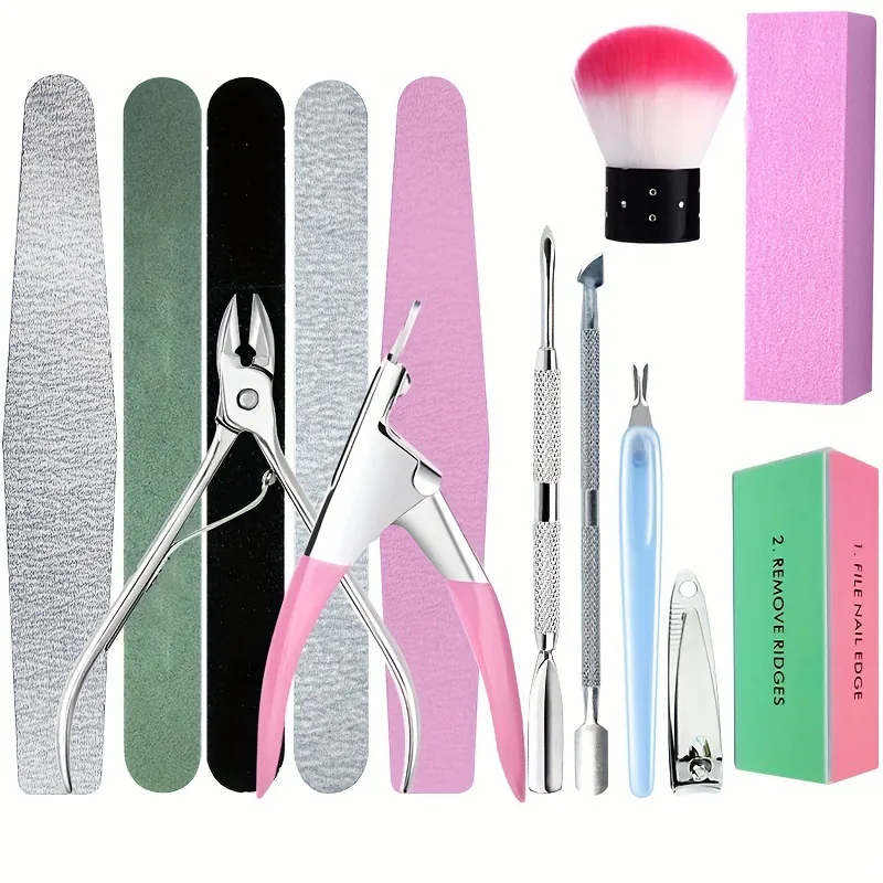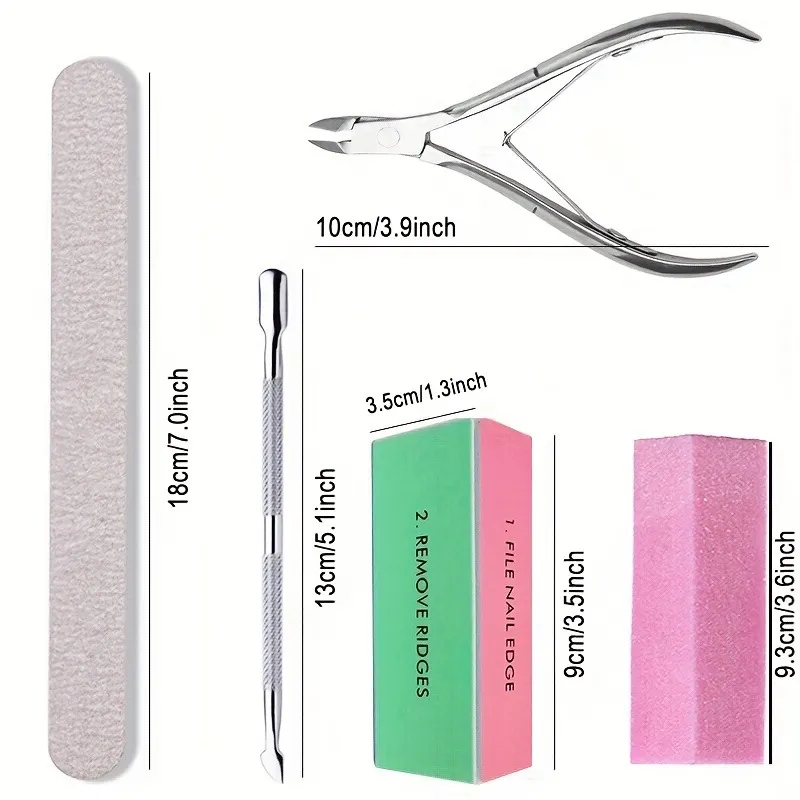 This comprehensive set includes high-quality cuticle nippers, nail files, buffers, and more to ensure precision and ease of use.