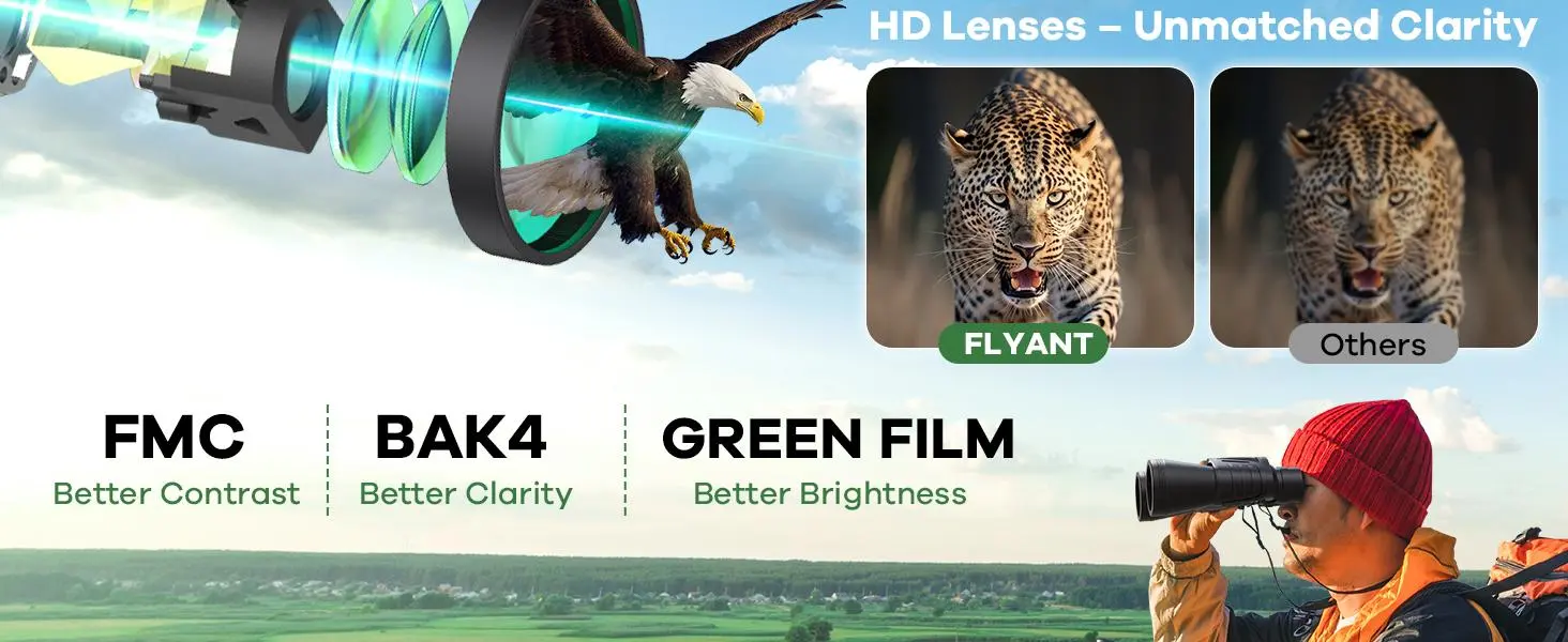 - ULTRA CLEAR IMAGE- Multilayer-coated aspherical lens elements provide superior light transmission and minimal distortion, better image brightness, contrast, and quality. BAK4 Porro Prism has a higher refractive index. It provides 99. 8% light transmission and improves color reproduction. Green FMC anti-reflective coating reduces the reflected light in the objective lens. It enhances light transmission, image brightness, and image sharpness. It will give you an extraordinary using experience.