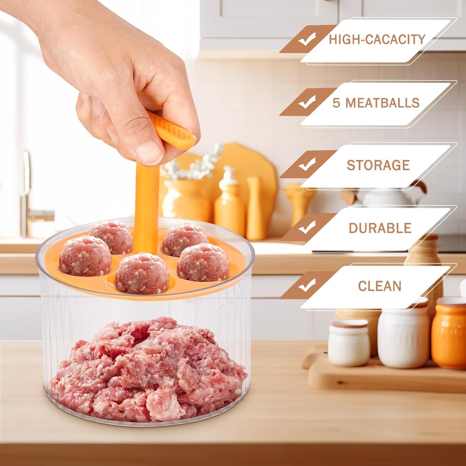 【Creative Kitchen Quintuple Meatball Maker】 This creative meatball maker is designed with a press and container, without getting your hands dirty! Say goodbye to sticky hands and messy countertops.