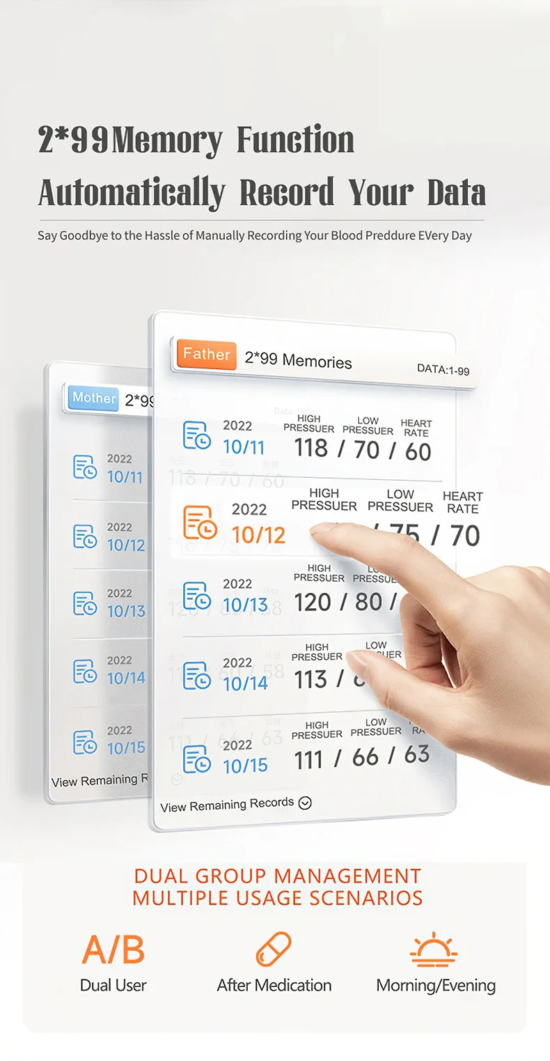 Memory Function: The device can store multiple readings, allowing you to track your blood pressure and heart rate over