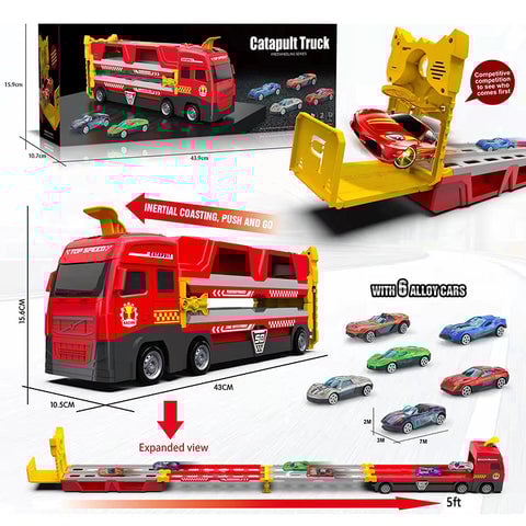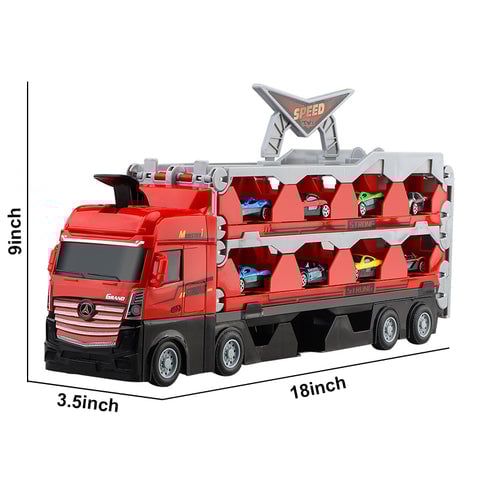 2-in-1 Transforming Vehicle: The massive Mega Hauler can carry more than 12 cars in its six expandable levels! There are even more great features that make this big hauler mega unique— connect and Deformation to track and roll your cars onto a side-by-side race. Layer upon layer, load your favorite cars, lift and go!