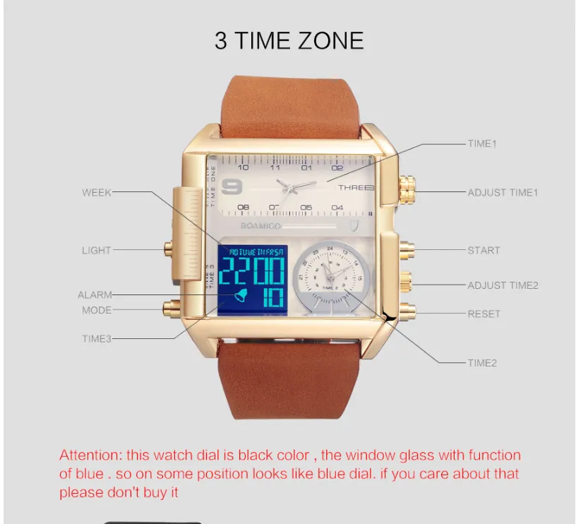 1. Function: 3 time zones, alarm clock, stopwatch, chronograph, LED light, date, week, month