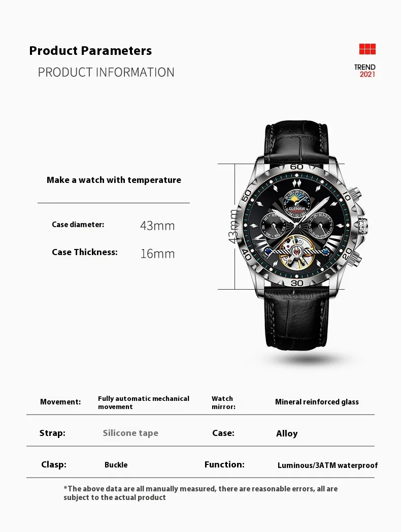 Crafted from high-quality materials, the Men's Fashion Hollowed-out Watch is built to last. The stainless steel case, coupled with the leather or stainless steel strap, ensures that this timepiece will maintain its appearance and functionality for years to come. The mechanical movement, when properly maintained, can last a lifetime, making it an excellent investment for watch enthusiasts.