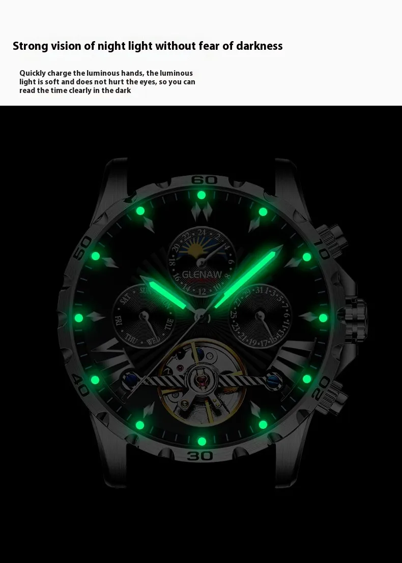 The case of this mechanical watch is crafted from high-quality stainless steel, providing a durable yet sleek finish. The polished surface of the case gives the watch a sophisticated, luxurious look, while the brushed steel adds a modern edge. Its robust construction ensures that it can withstand the rigors of everyday wear, making it both stylish and practical.