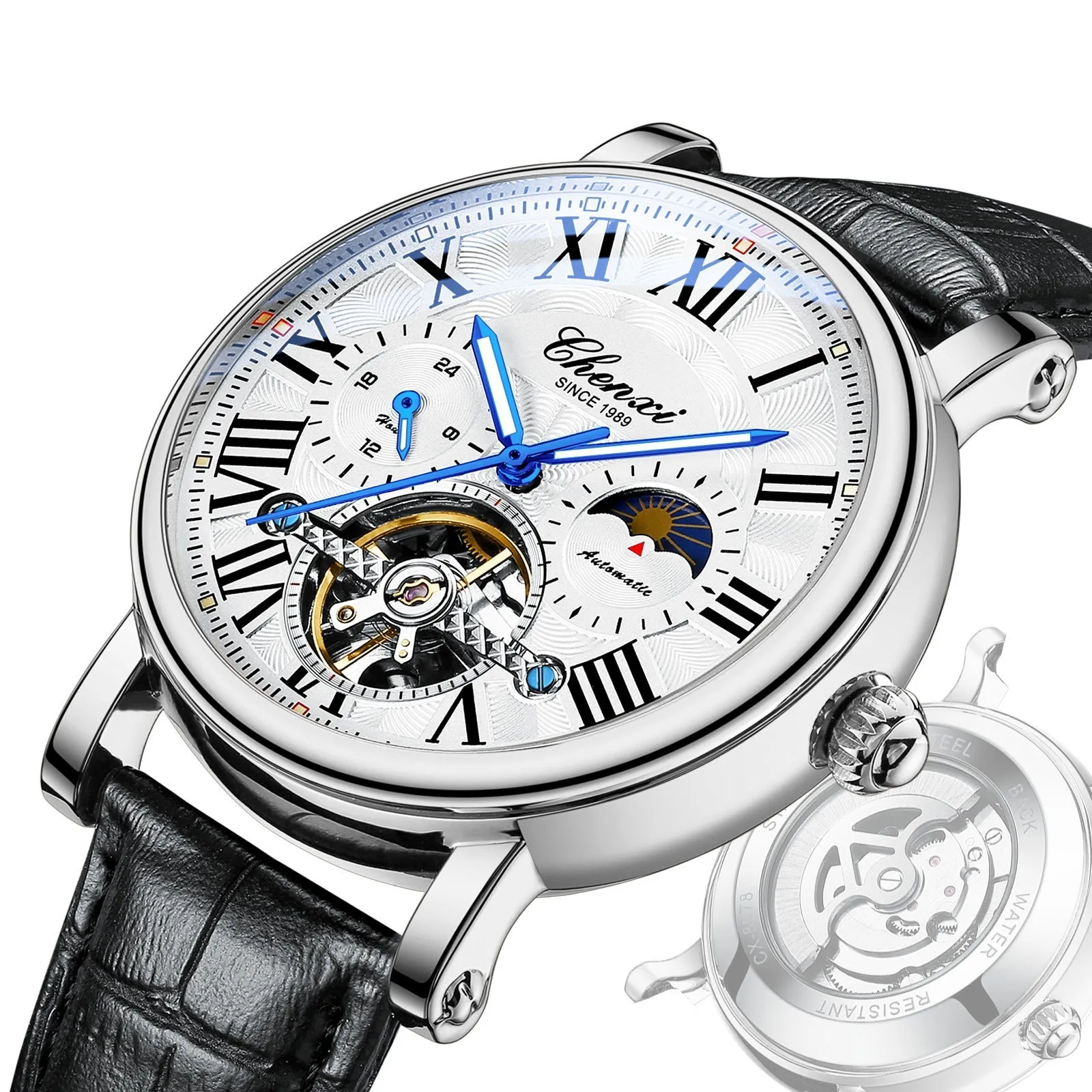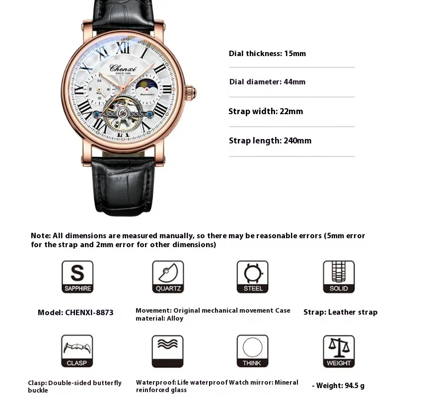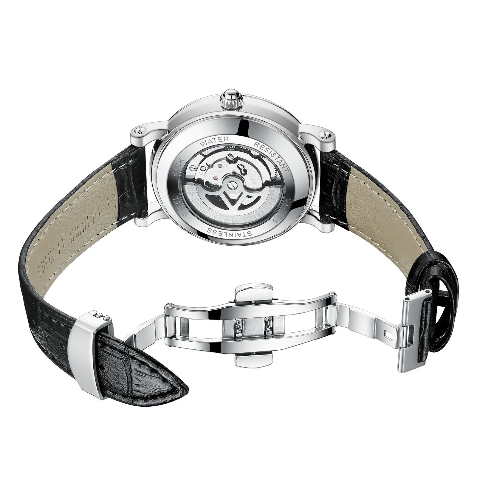 This high-end mechanical watch is powered by automatic movement, which means it is powered by the natural motion of your wrist. The self-winding mechanism eliminates the need for batteries and keeps the watch running without any external power source.