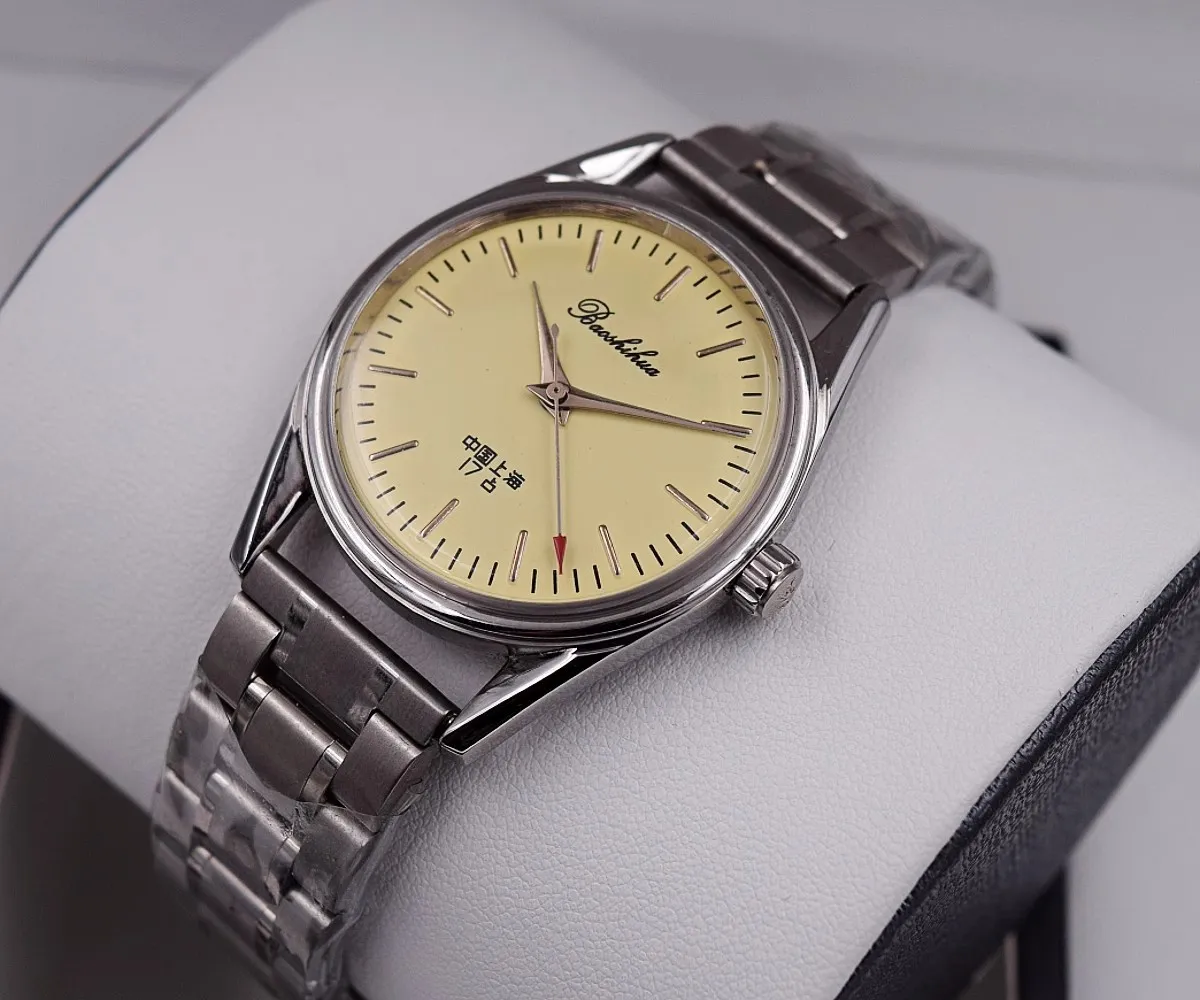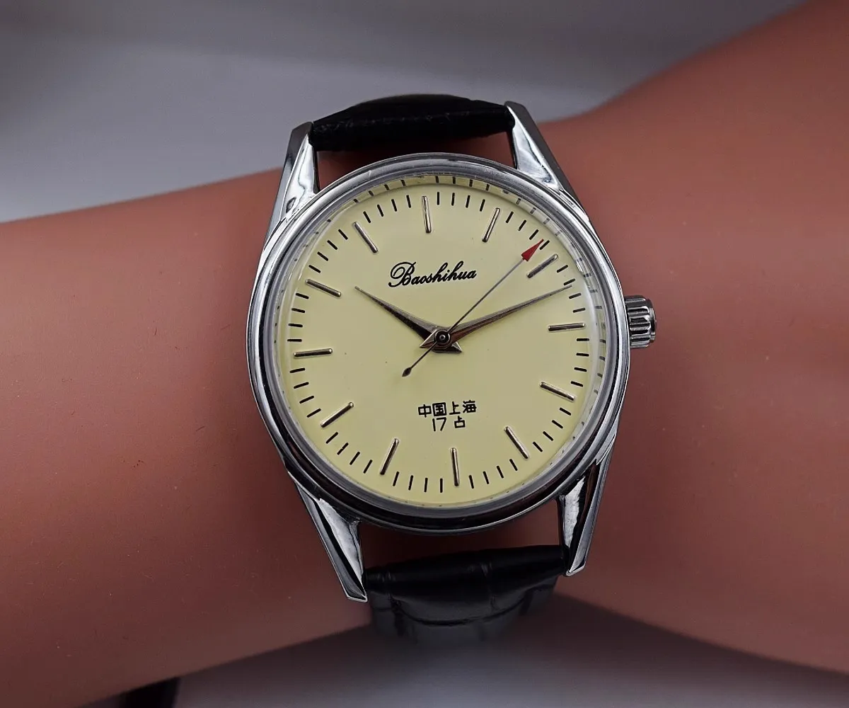 At the heart of this watch is a manual spring-wound mechanical movement, offering a tactile connection to traditional watchmaking. Unlike automatic or quartz movements, the manual winding mechanism requires regular winding by hand, giving wearers a hands-on experience with the art of timekeeping.