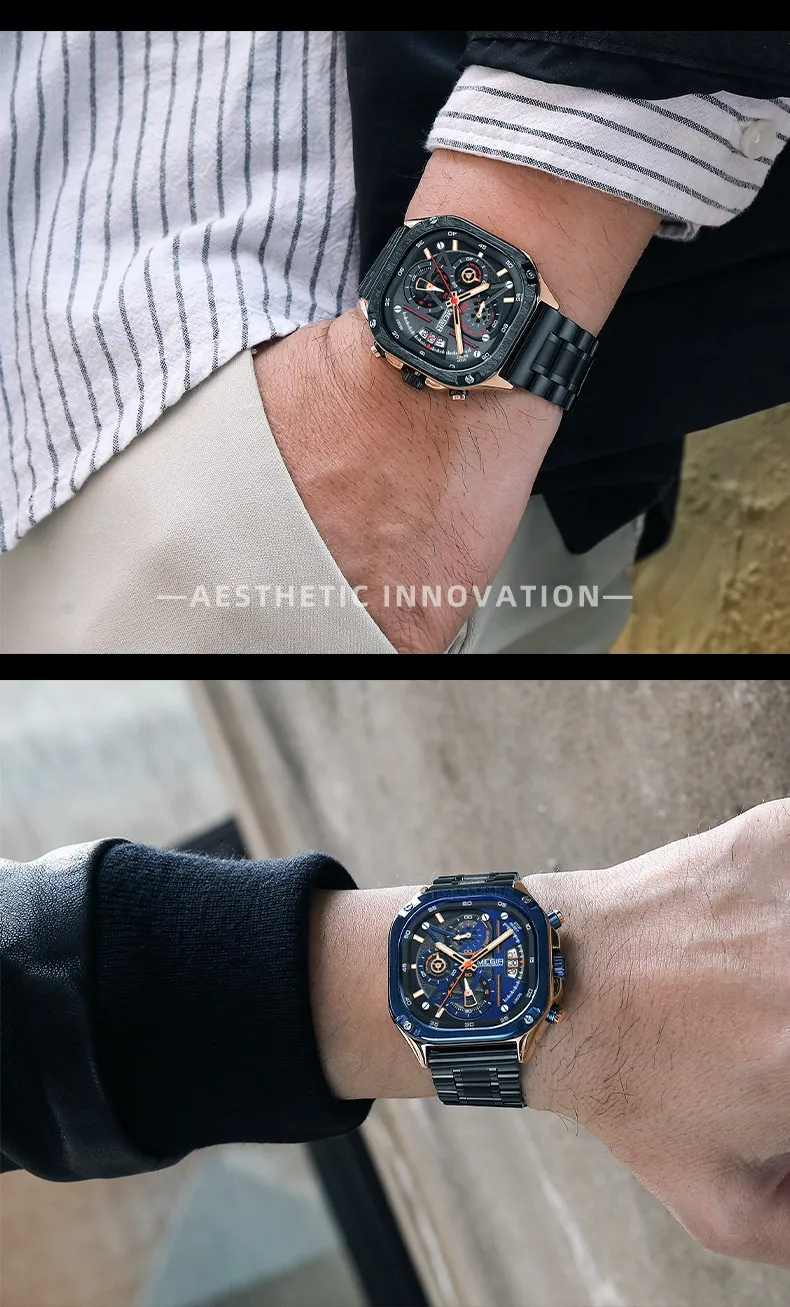 The Men's Square Steel Strap Butterfly Buckle Luminous Waterproof Multi-Function Watch is a striking blend of contemporary design,