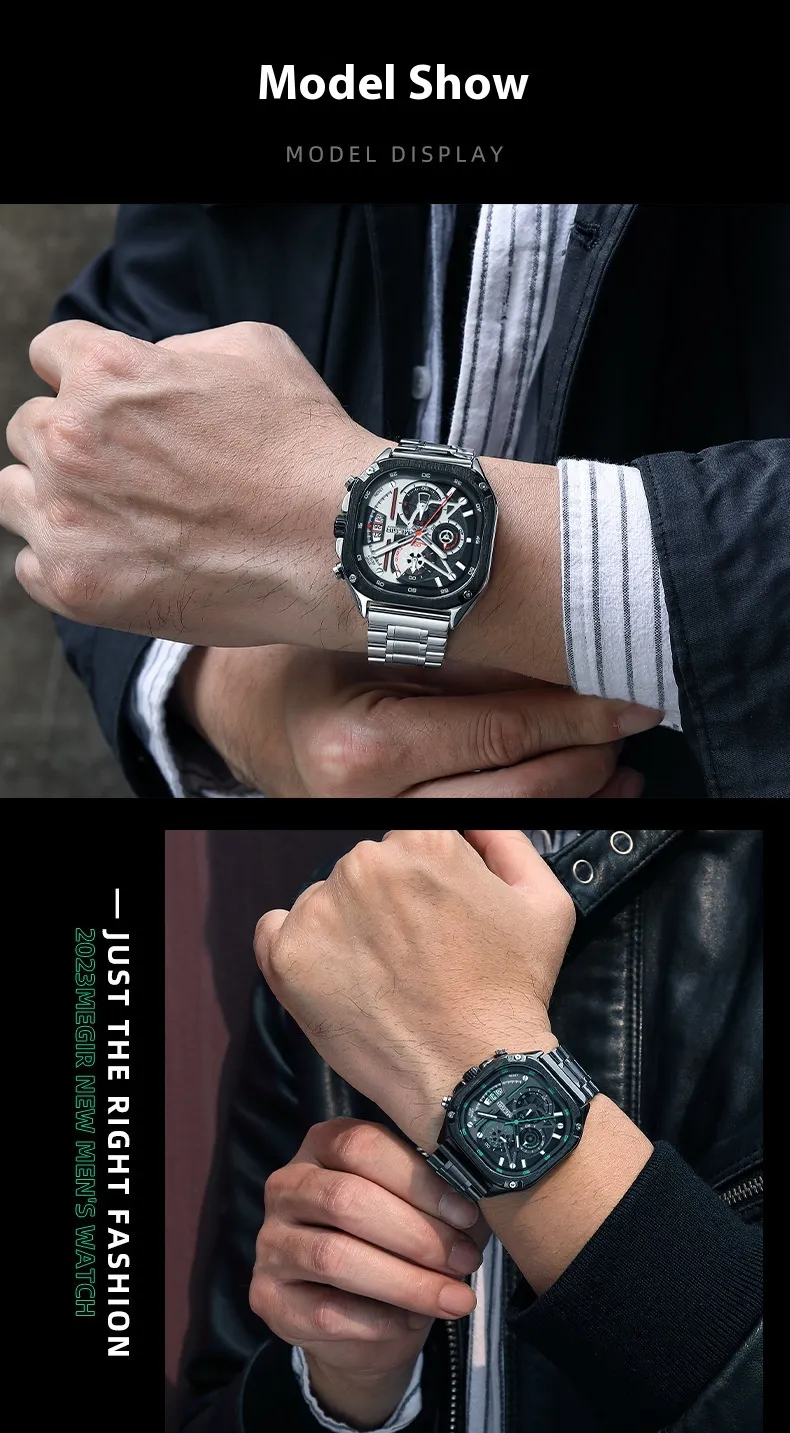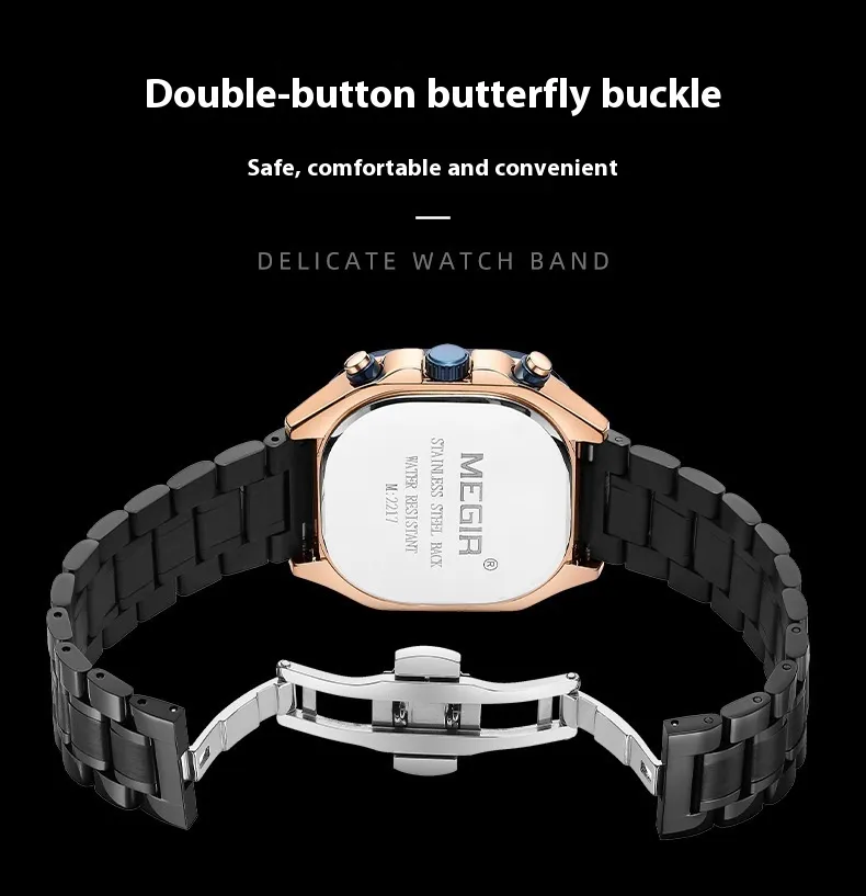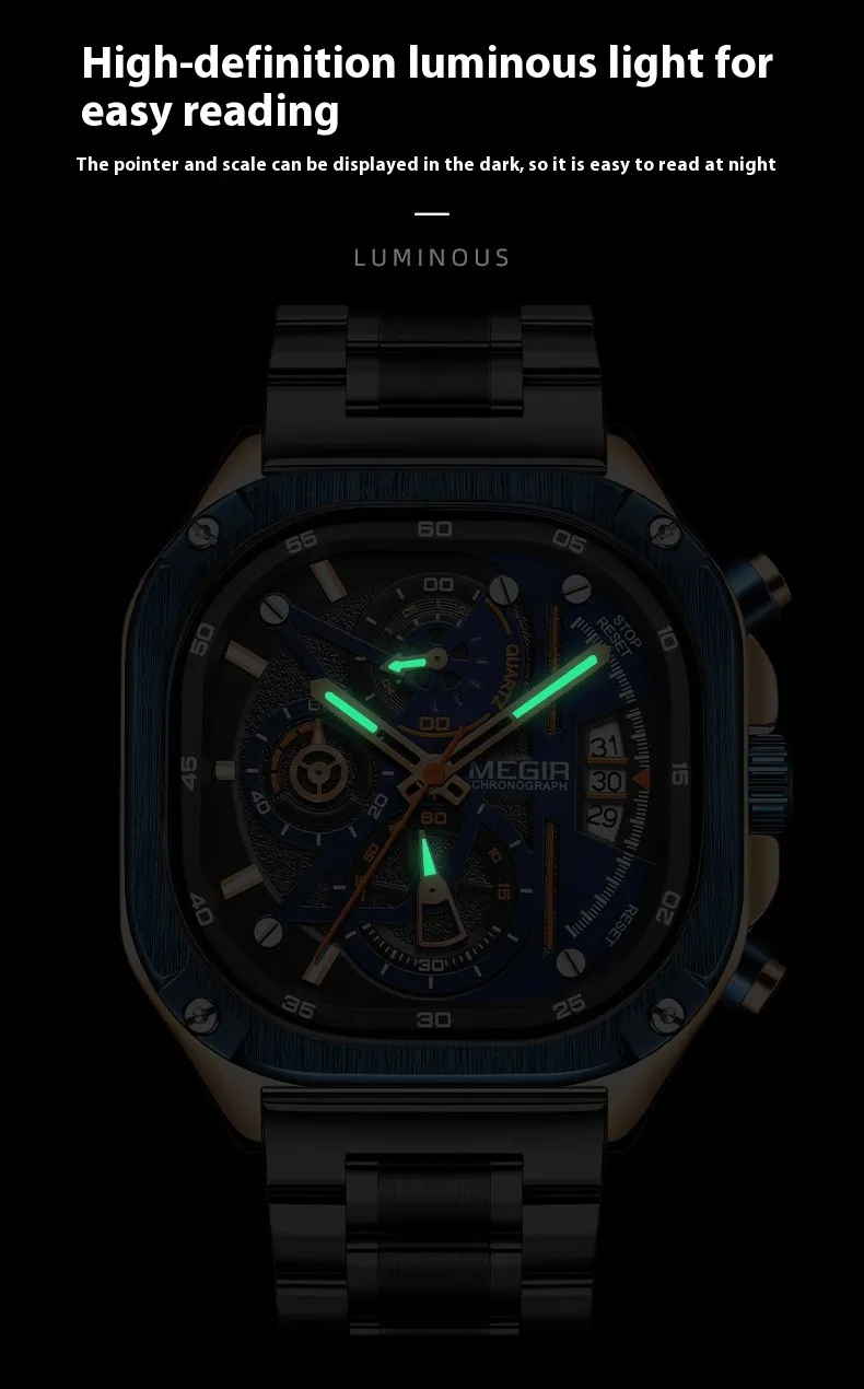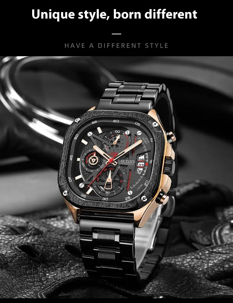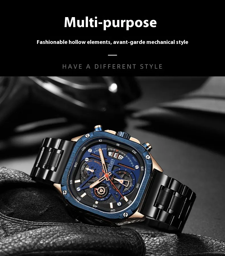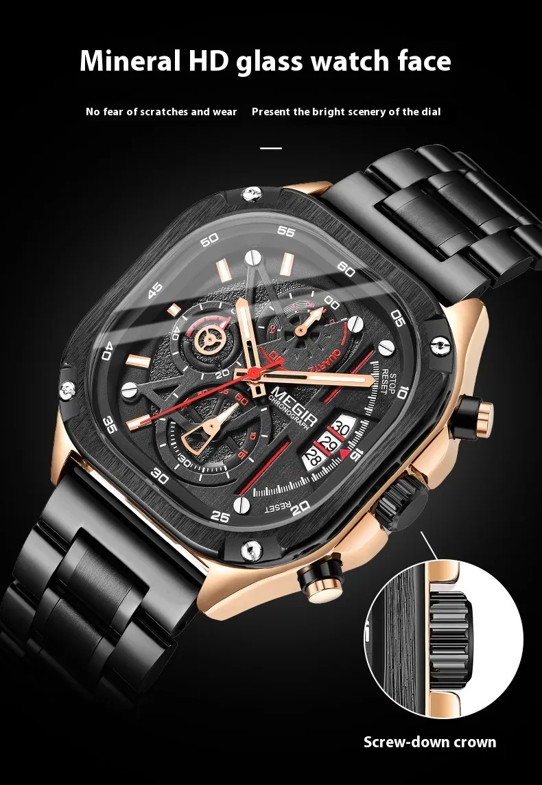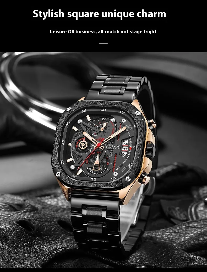 The Men's Square Steel Strap Butterfly Buckle Luminous Waterproof Multi-Function Watch is a striking blend of contemporary design,