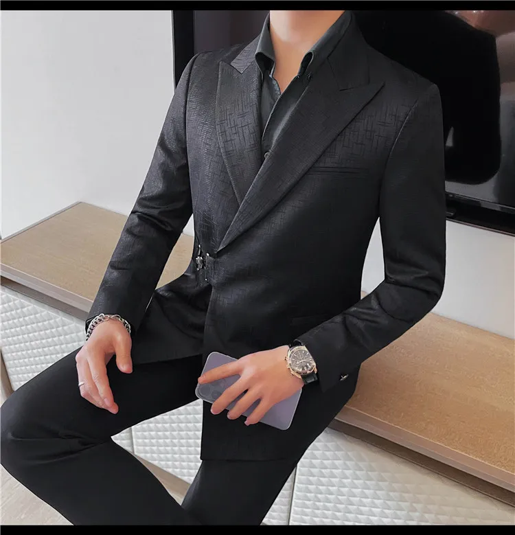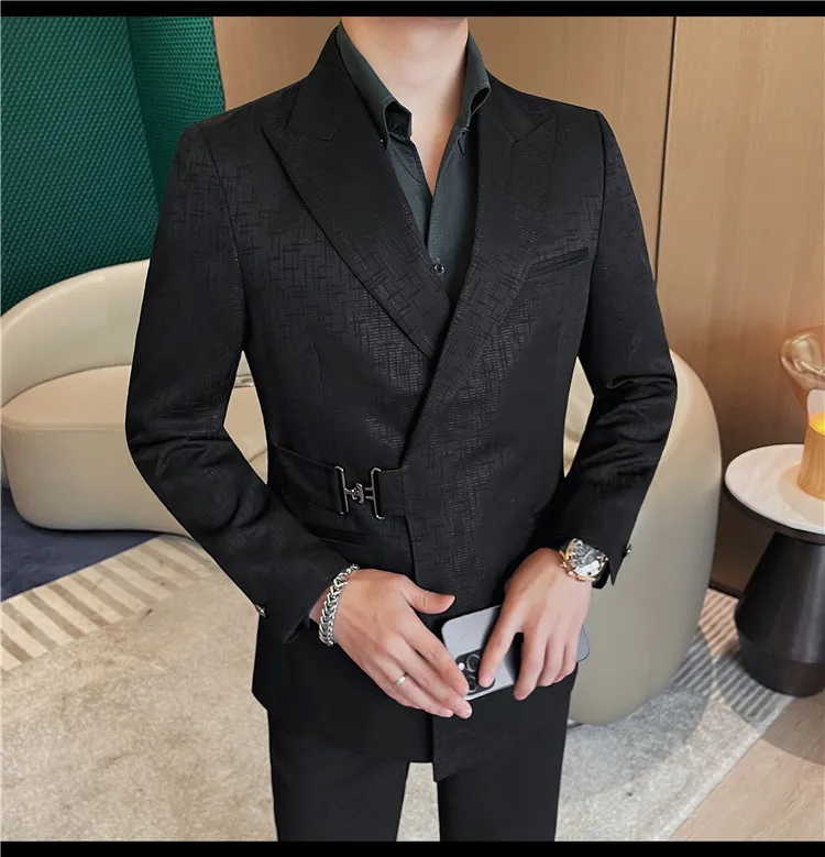 The Men's Suit Metal Buckle Design Gun Collar Jacket is a must-have for anyone looking to make a statement with their formal attire. Its bold design, coupled with the high-quality fabric and tailored fit, provides the perfect blend of style, comfort, and sophistication. Whether you're attending a corporate event, a social gathering, or a formal dinner, this jacket ensures that you look sharp and stylish. Elevate your wardrobe with this unique piece and embrace a fresh take on traditional men's fashion.