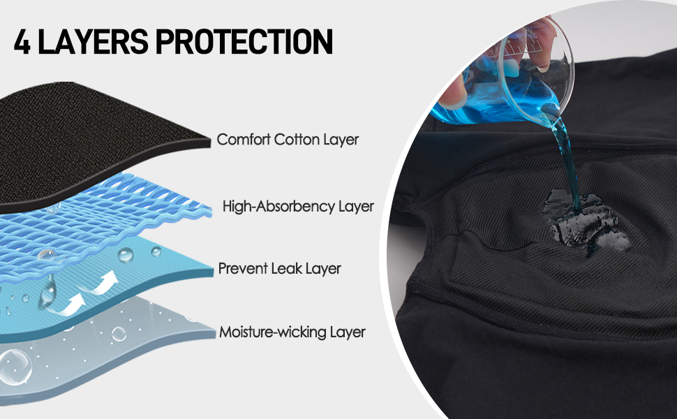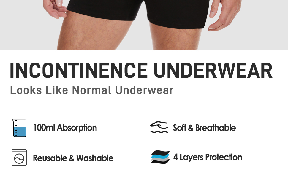 - FOUR LAYERS OF PROTECTION - These men's incontinence underwear are designed with four layers of protection, including an absorbent layer, a leak-proof layer and an inner and outer cotton layer, which work together to ensure no leakage and provide all-day peace of mind