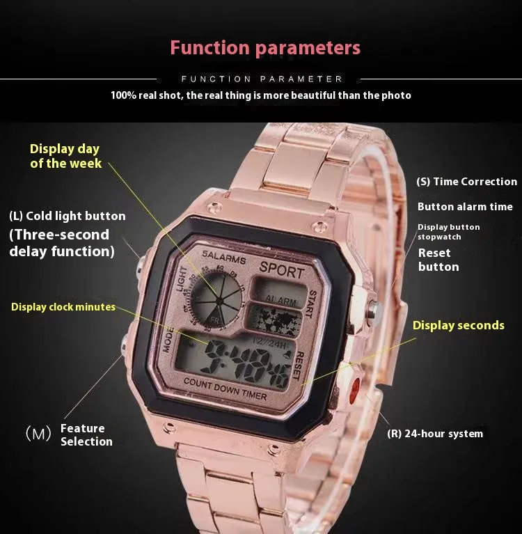 With its fashion-forward design and glowing LED feature, this watch is not just a timepiece—it’s a statement. Whether you’re a trendsetter