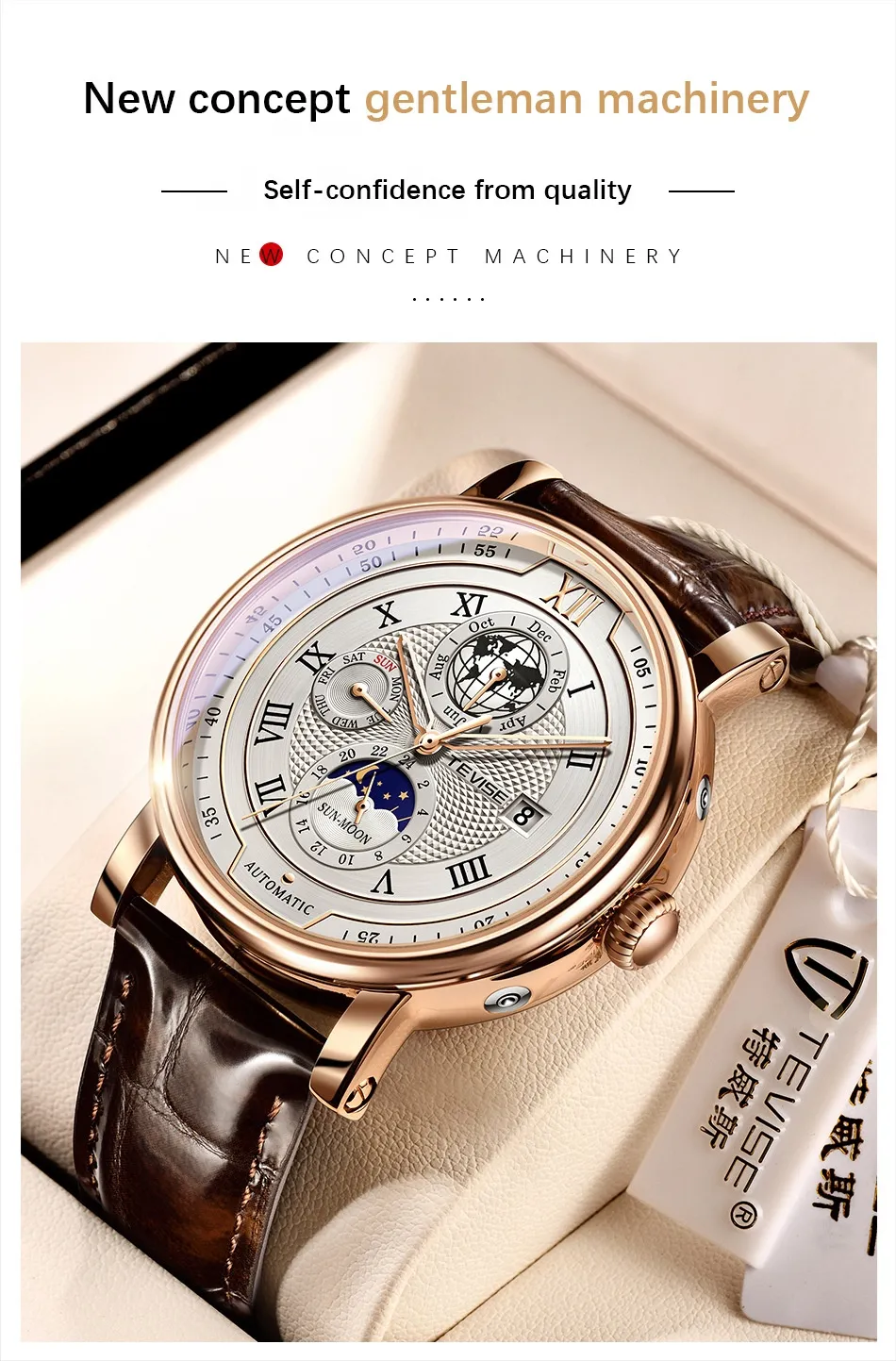 Experience the beauty of celestial mechanics with the Men's Waterproof Moon Phase Automatic Mechanical Watch, a luxurious timepiece