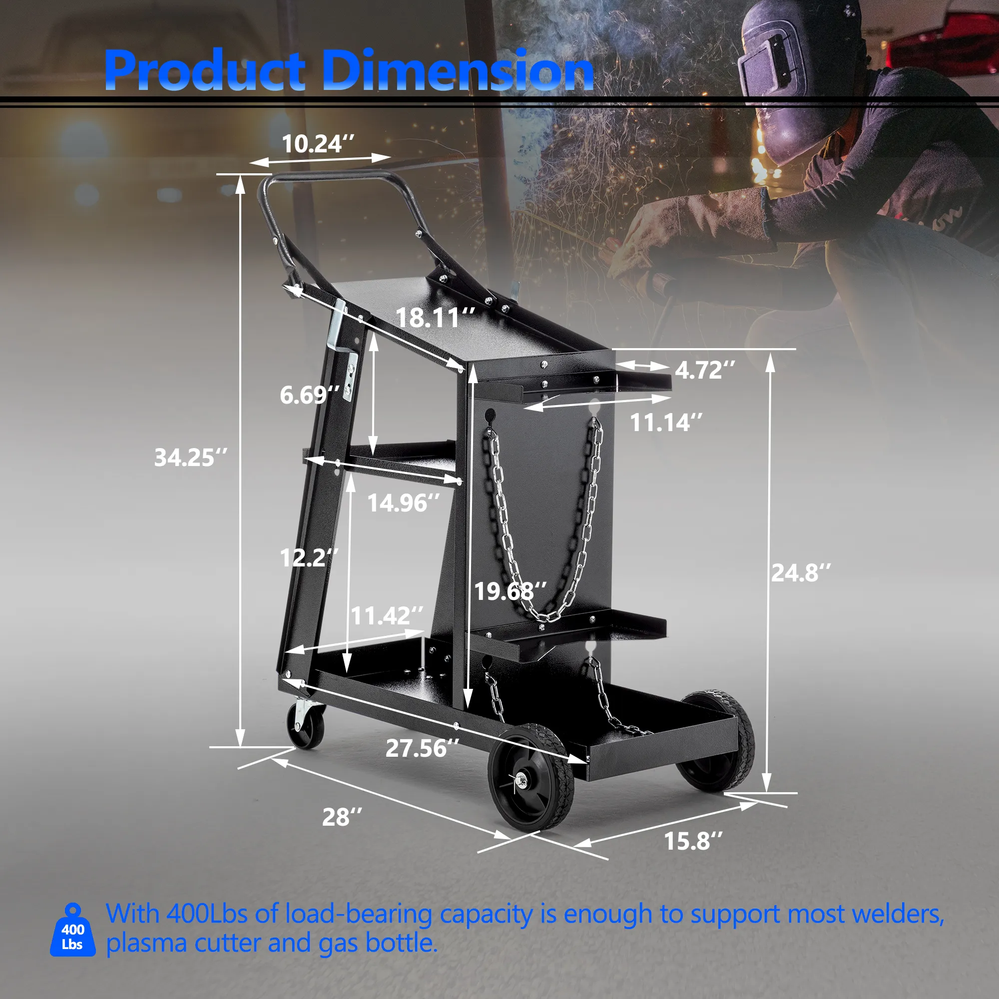 Product Name:Welding Cart, 3-Tier Welder Cart Heavy Duty with 400Lbs Static Weight Capacity, 360° Swivel Wheels, Tank Storage Safety Chains, Rolling MIG Welder Cart for TIG, ARC, MMA Welding Machine