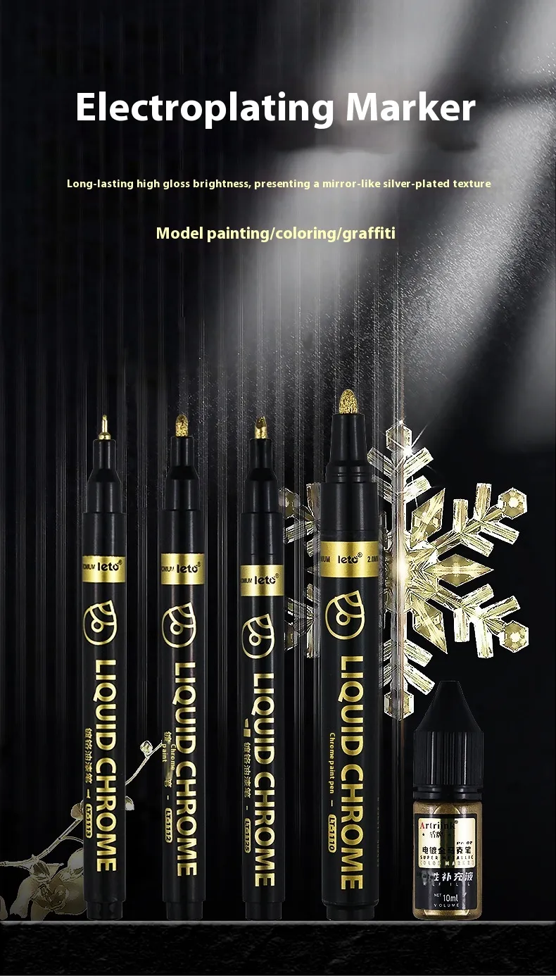 The Metal Mirror Liquid Chrome Plated Marker is a specialized tool designed to replicate the appearance of chrome plating on various surfaces. These markers are particularly popular among model enthusiasts, artists, and DIYers for their ability to produce a high-gloss, reflective finish that closely resembles real chrome.