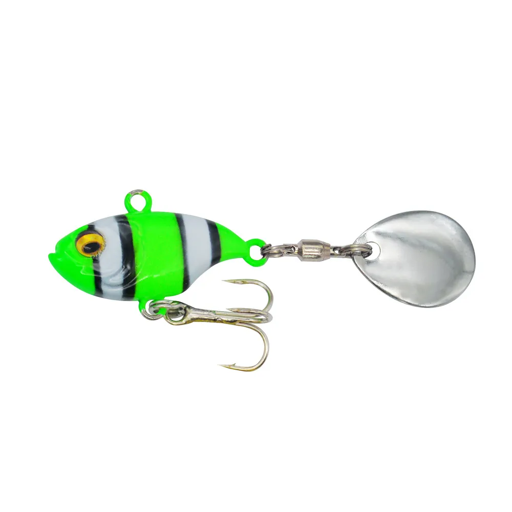 One of the most striking features of this lure is the rotating sequins attached to the metal plate. These sequins create a flash that simulates the movement of small fish or baitfish, making it a highly effective attractant for predatory fish. The rotating sequins are designed to catch and reflect light, producing a shimmering effect that grabs the attention of fish from a distance.