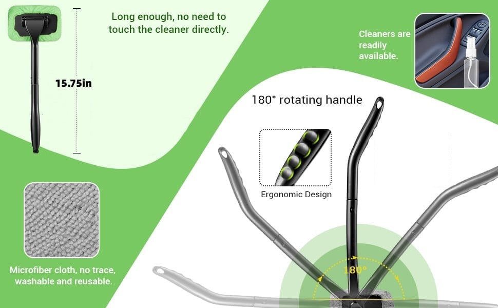 The car window cleaner is designed with head of car cleaning wand can be rotated 180 degrees to fit the glass curved surface very well, removing dirt and dust from car windshields or glass, saving your more effort