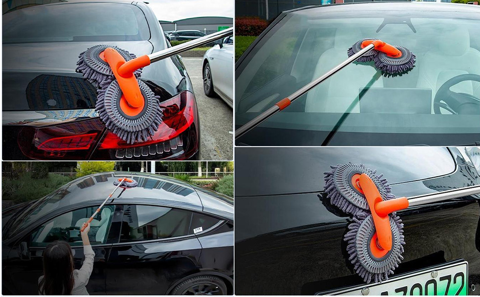 - 𝐃𝐎𝐔𝐁𝐋𝐄 𝐇𝐄𝐀𝐃 𝐃𝐄𝐒𝐈𝐆𝐍- This car wash mop brush features a double head chenille microfiber head, which provides a larger cleaning range for more efficient coverage. The chenille microfiber is soft, absorbent, and foams easily, ensuring a scratch-free cleaning experience that won't damage the paint of your car.