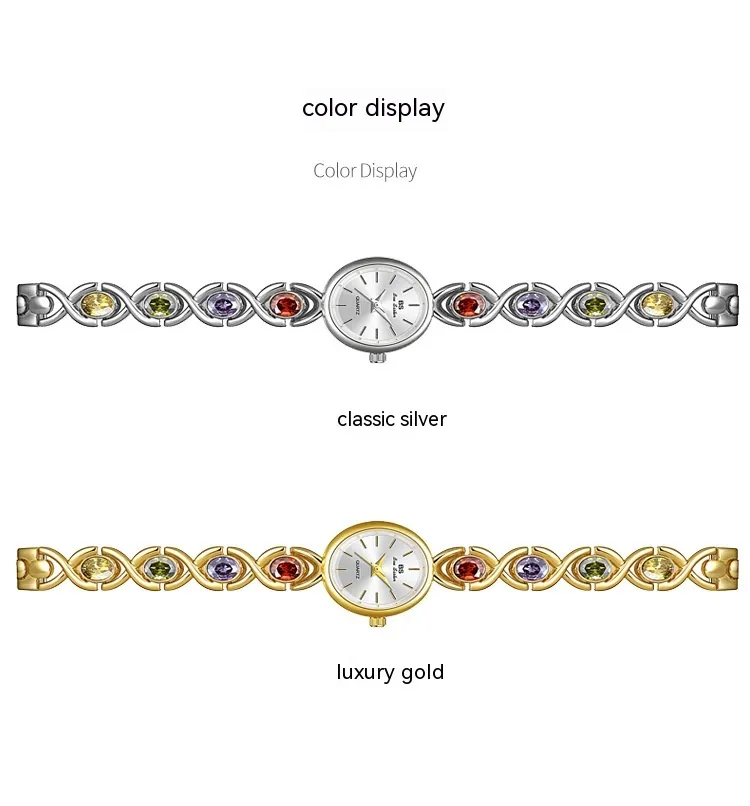 The Mid-Ancient Fashion Oval Colored Gems Rainbow Light Luxury Watch is an exquisite timepiece that blends ancient-inspired aesthetics with modern luxury. Featuring a beautifully crafted oval dial, this watch is adorned with an array of colored gems that reflect a rainbow of light, creating a captivating and luxurious look. The mid-ancient design pays homage to timeless elegance, with intricate detailing and vibrant colors that evoke a sense of royalty and sophistication. This stunning watch is perfect for women who appreciate high fashion, art, and a unique blend of historical inspiration and contemporary luxury.