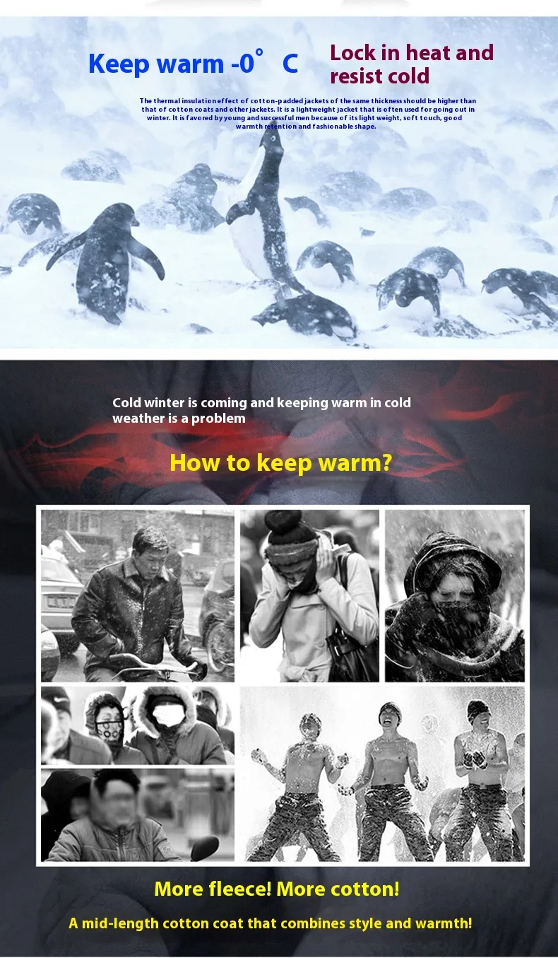 This jacket is the ultimate combination of warmth, comfort, and style. With its thermal velvet lining, thick cotton-padded insulation, and versatile mid-length design, it’s perfect for men who want to stay cozy and fashionable during autumn and winter.