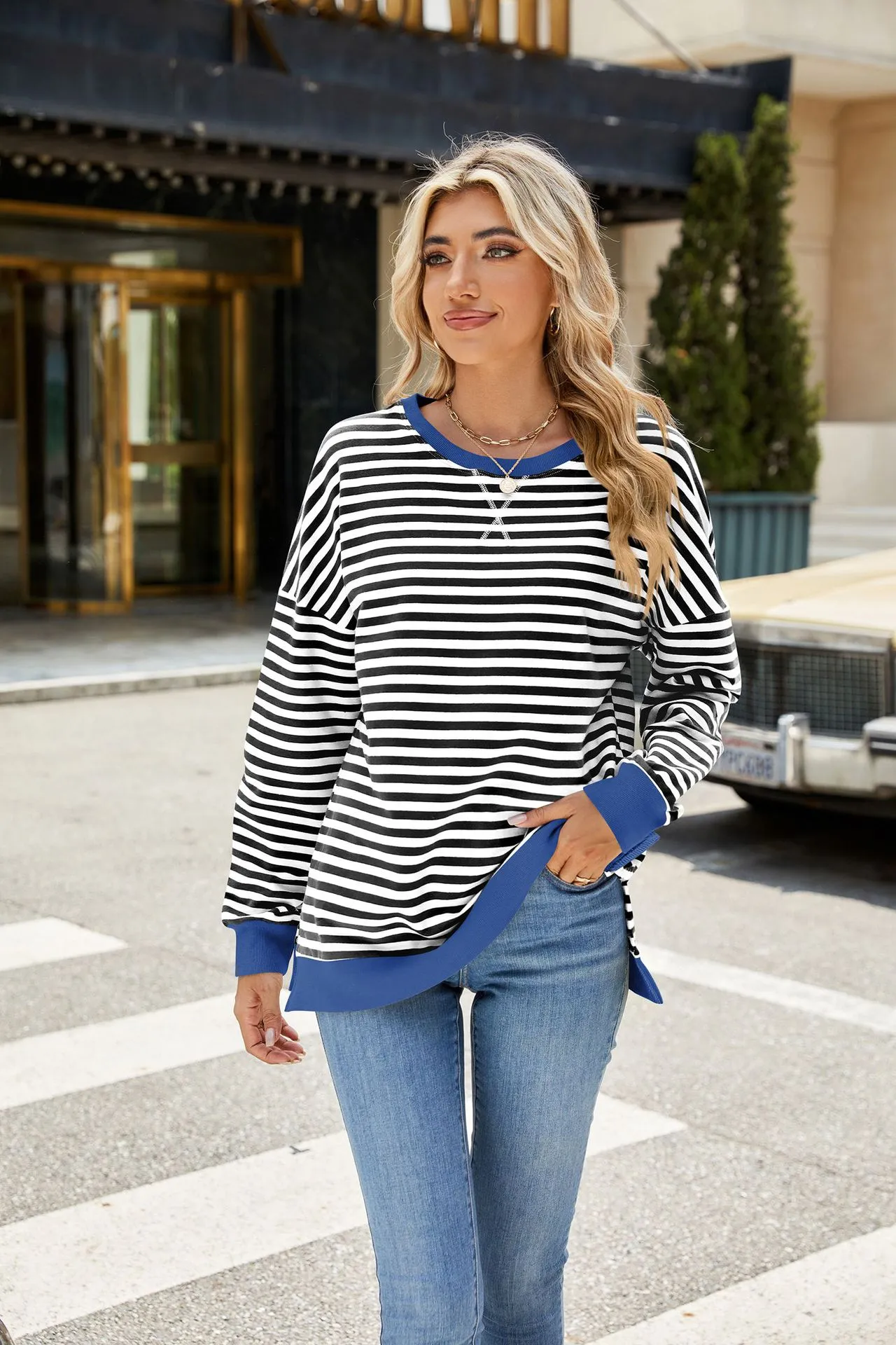 Versatility This striped pullover top is incredibly versatile, making it easy to style for various occasions. Pair it with jeans or leggings for a laid-back, casual look, or dress it up with a skirt and boots for a more polished ensemble. The mix of colors and the split design make this top a standout piece that can be worn for both casual outings and more relaxed social events.