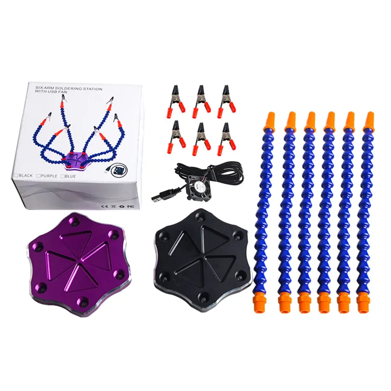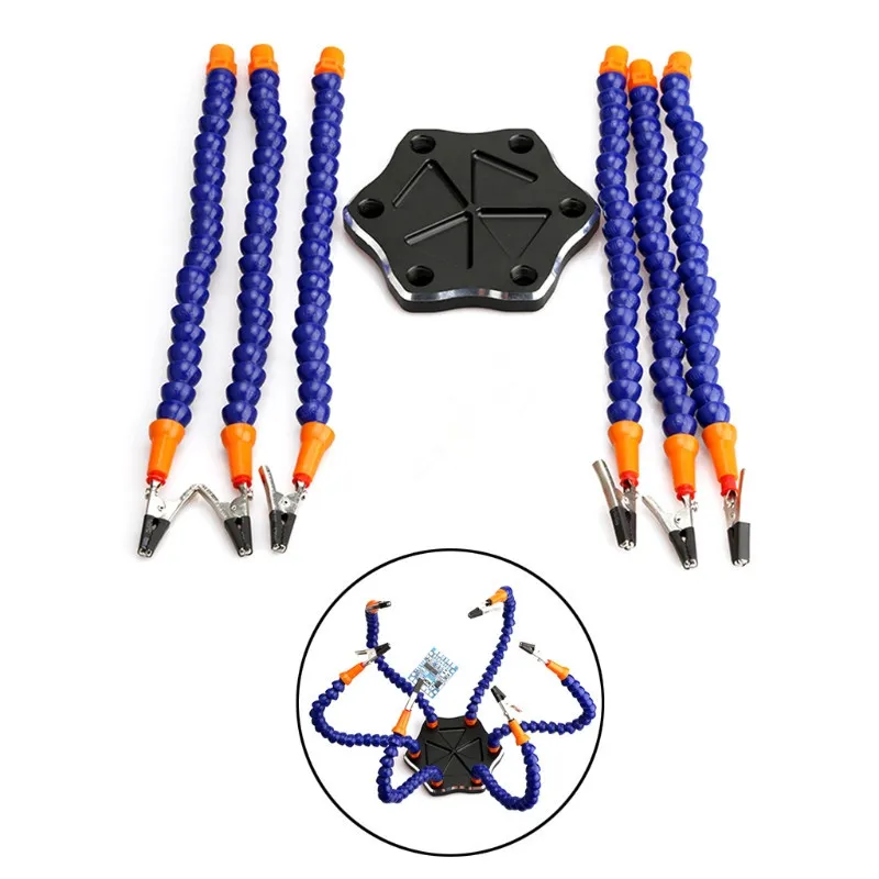 The station features six adjustable jaws that provide a firm and secure hold on various items, from model components to small electronics. The adjustable design allows users to position the jaws for precise holding, accommodating a wide range of shapes and sizes. This six-jaw system is ideal for stabilizing small parts during repair, assembly, or soldering, preventing slippage and ensuring accuracy.