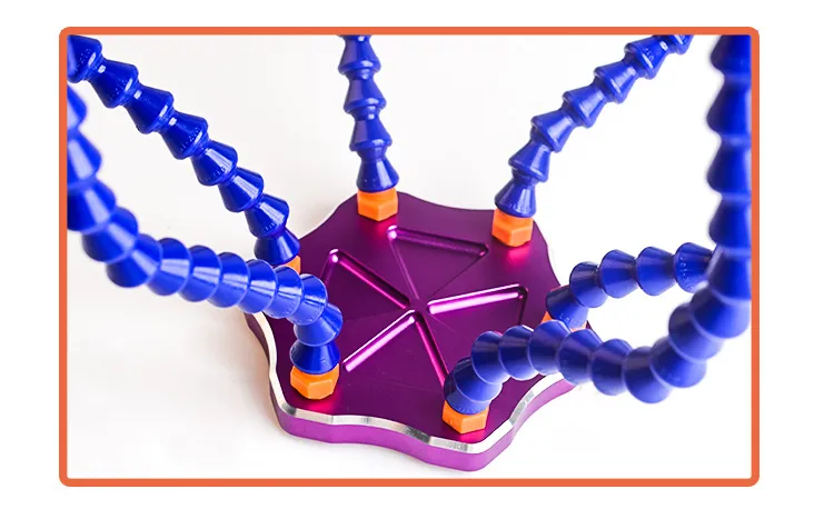 The bottom layer is non-slip, and the soldering station is aluminum, so it won't slip. Multi-function tool table, 6-arm multi-purpose, suitable for model aircraft plugs, flight control of flying aircraft, etc., can help you complete various complex welding. At the same time, the large piece of all-metal used in the bottom plate, only the bracket can be bent arbitrarily, which can be easily Clamp up any object waiting to be welded, the head chuck can also be rotated 360 degrees at will, and the internal groove can accommodate various screws and materials required for welding.
