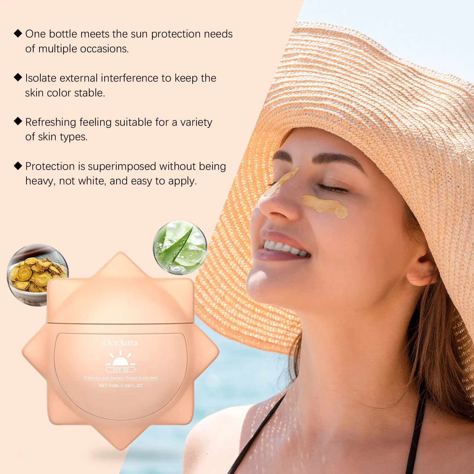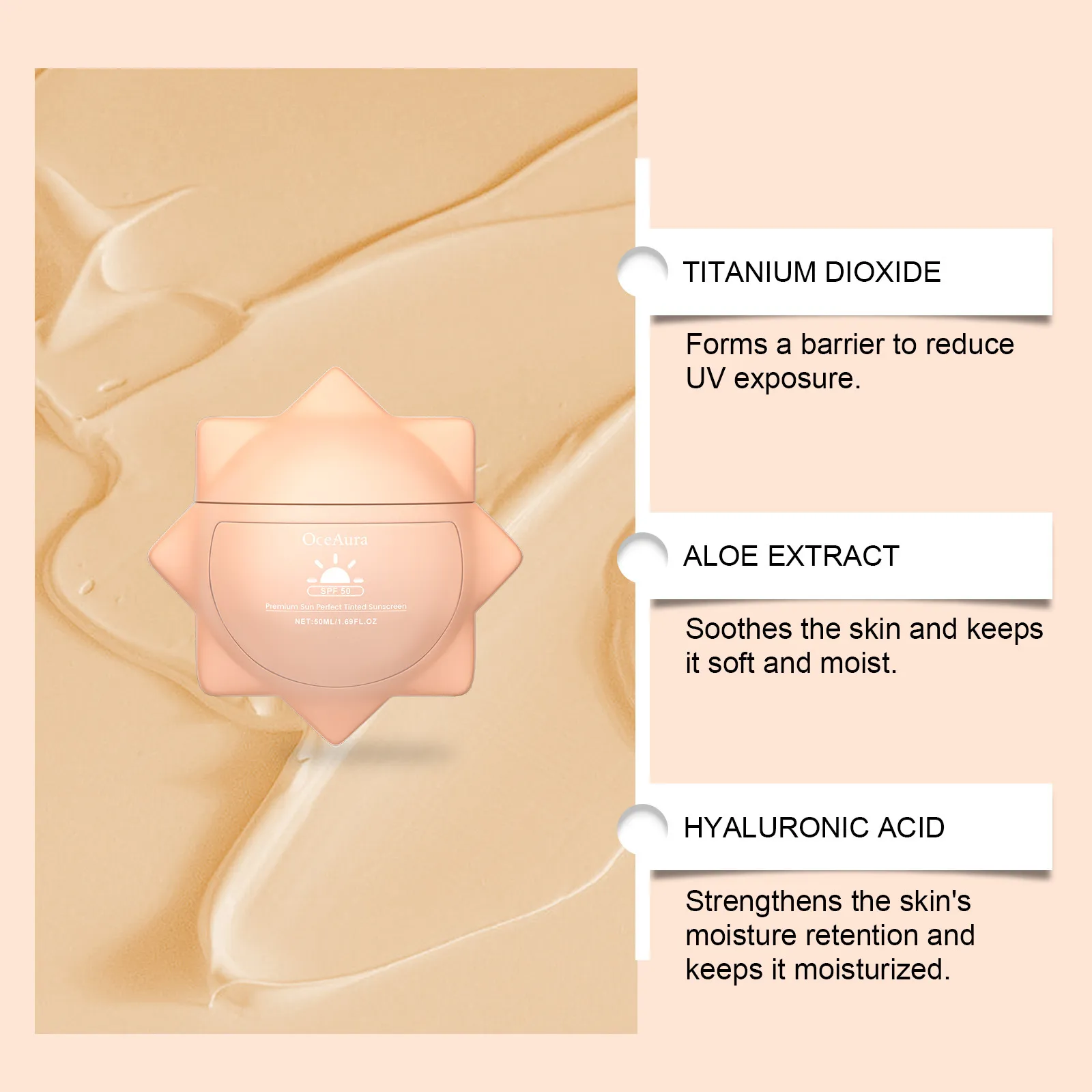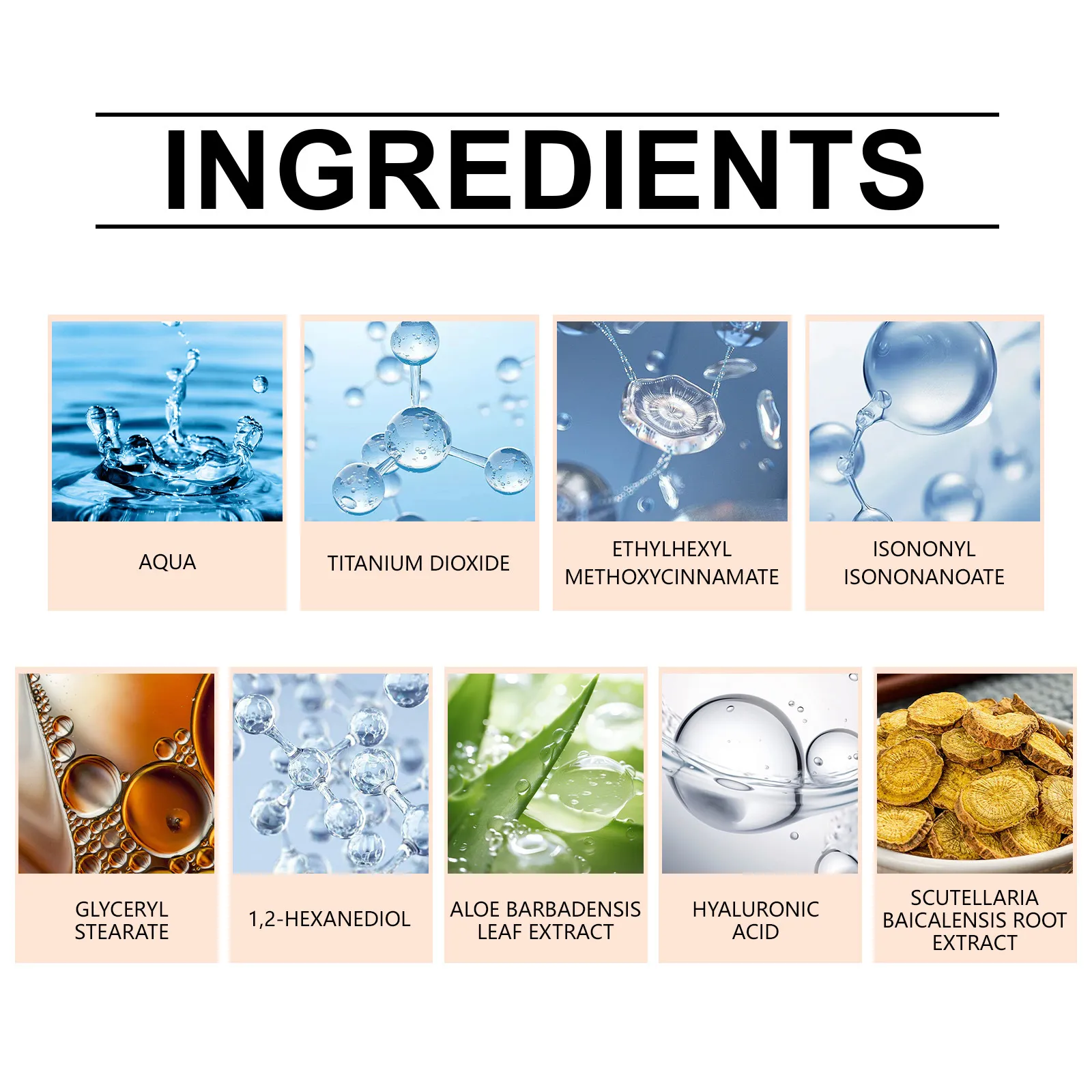 Ingredients:Water, titanium dioxide, ethyl hexyl methoxycinnamate, isononyl isonononate, Glyceryl stearate, 1, 2-hexanediol, aloe extract,
