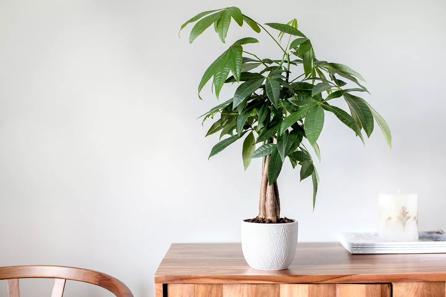 Description: Native to central and South America, the Money Tree is a braided tree that can grow up to 6-8 feet indoors or be trained as a bonsai. In east Asia, the Money Tree is often used by those who practice Feng Shui to bring positive "Chi", or energy, into the room, thus being a popular housewarming gift. On top of that, it is a hardy plant that requires relatively low maintenance. It can tolerate direct sunlight, but prefers bright indirect light, lots of water, and warm temperatures.How to Grow and Care for the Money Tree