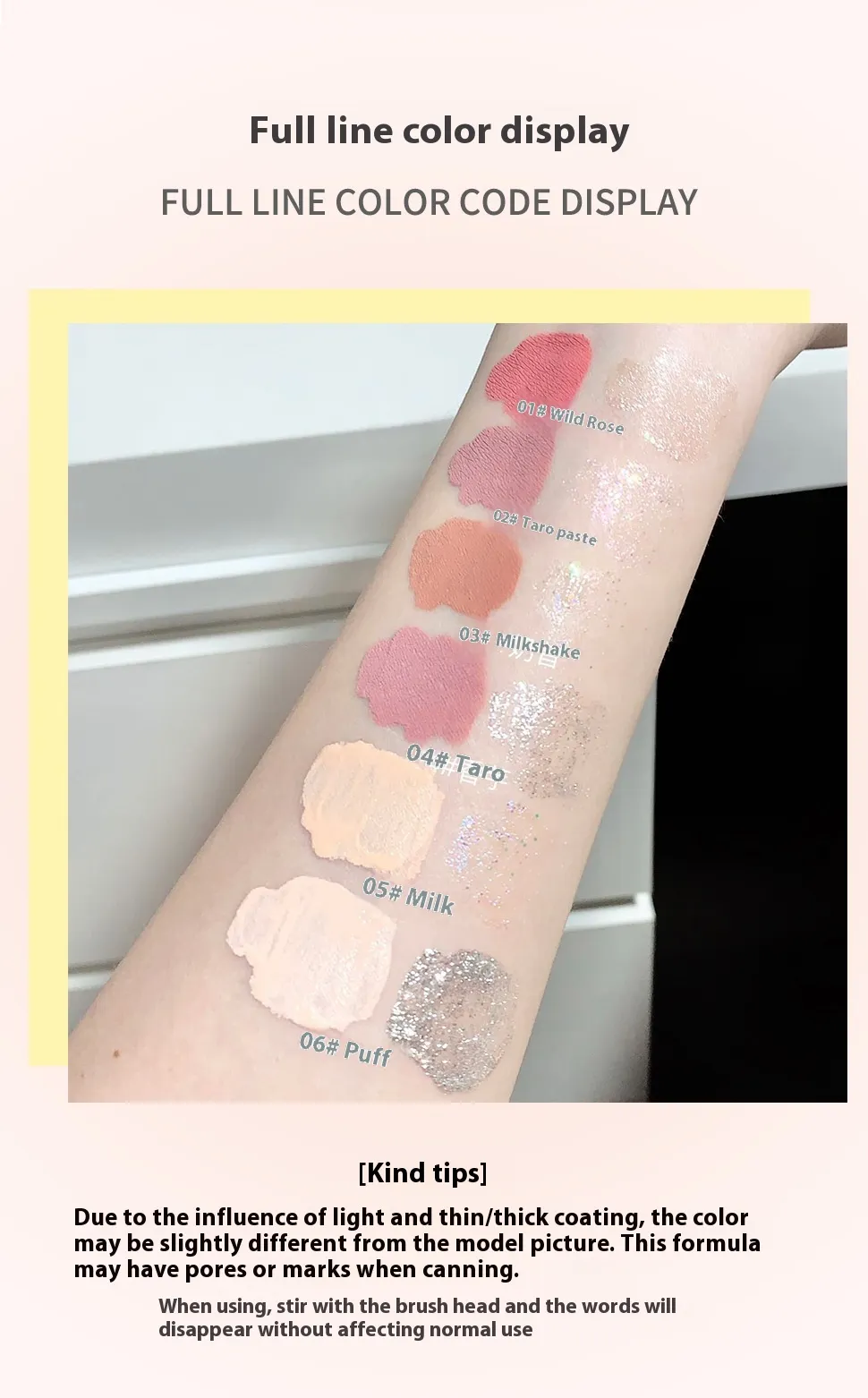 Color classification: 01# wild berry, 02# Taro, 03# milkshake, 04# sweet potato, 05# nougat pastry, 06# puff
