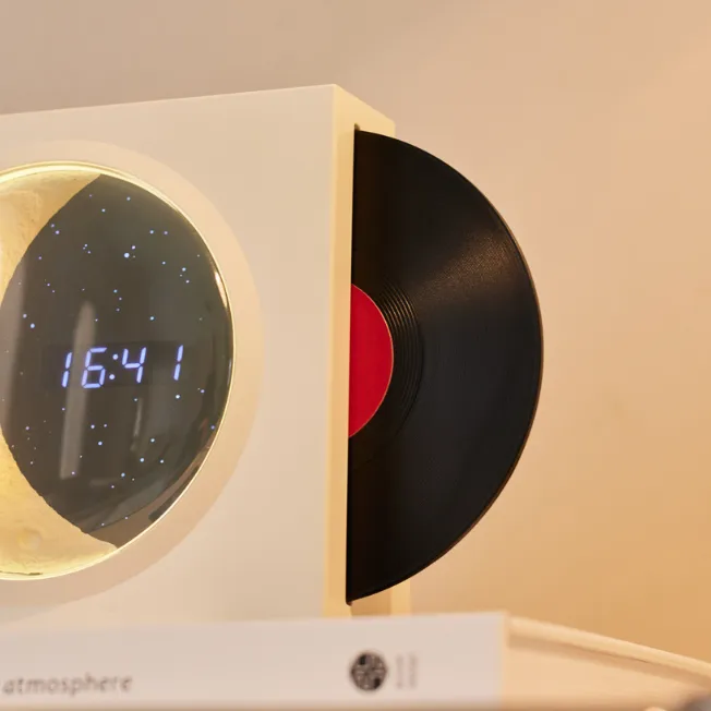 Designed with a retro vinyl look, the Moon Clock Bluetooth Speaker serves as both a functional clock and a high-quality speaker, making it a great addition to your decor. Whether you're using it for listening to music, checking the time, or simply adding a touch of nostalgia to your room, this Bluetooth speaker delivers great sound and a stylish design all in one.