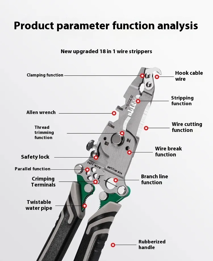 The Multifunctional Folding Wire Stripper is a thoughtfully engineered hand tool that combines several essential wire-handling functions into a single compact unit. Designed to fold neatly for safe storage and easy transport, it offers professional-grade functionality while remaining accessible for everyday users. This tool is especially useful in environments where space is limited, such as tool belts, backpacks, glove compartments, or small workshops.